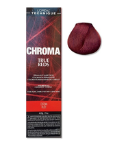 Chroma Ruby hair dye utilizes a unique red dye technology for LโOreal Technique that delivers key benefits to customers looking for beautiful red hair color. This permanent hair color has been formulated with Anti-Breakage Ceramide R Complex which penetrates the hairs cortex to condition and help protect against breakage. CHROMA True Reds are long-lasting. After repeated shampooing, color stays deep and true without shifting tone. CHROMA True Reds features unique red hues for LโOreal Technique; high intensity deep garnet and deep red color shades. They are suitable for use on all bases of hair, light, dark and 100% gray delivering identifiable red color results on all natural levels of hair. In addition, True Reds provides excellent gray coverage with deep color and highlights on high percentages of gray hair.