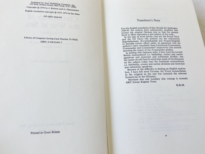 1976 HC Chronology of the War at Sea, 1939-1945 by J. Rohwer; G. Hummelchen