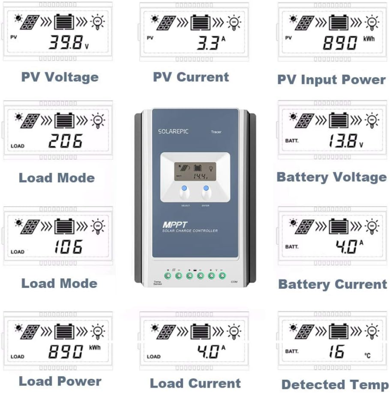 With attached extension cable, it will showing the operational data and working status of connected MPPT charge controller.