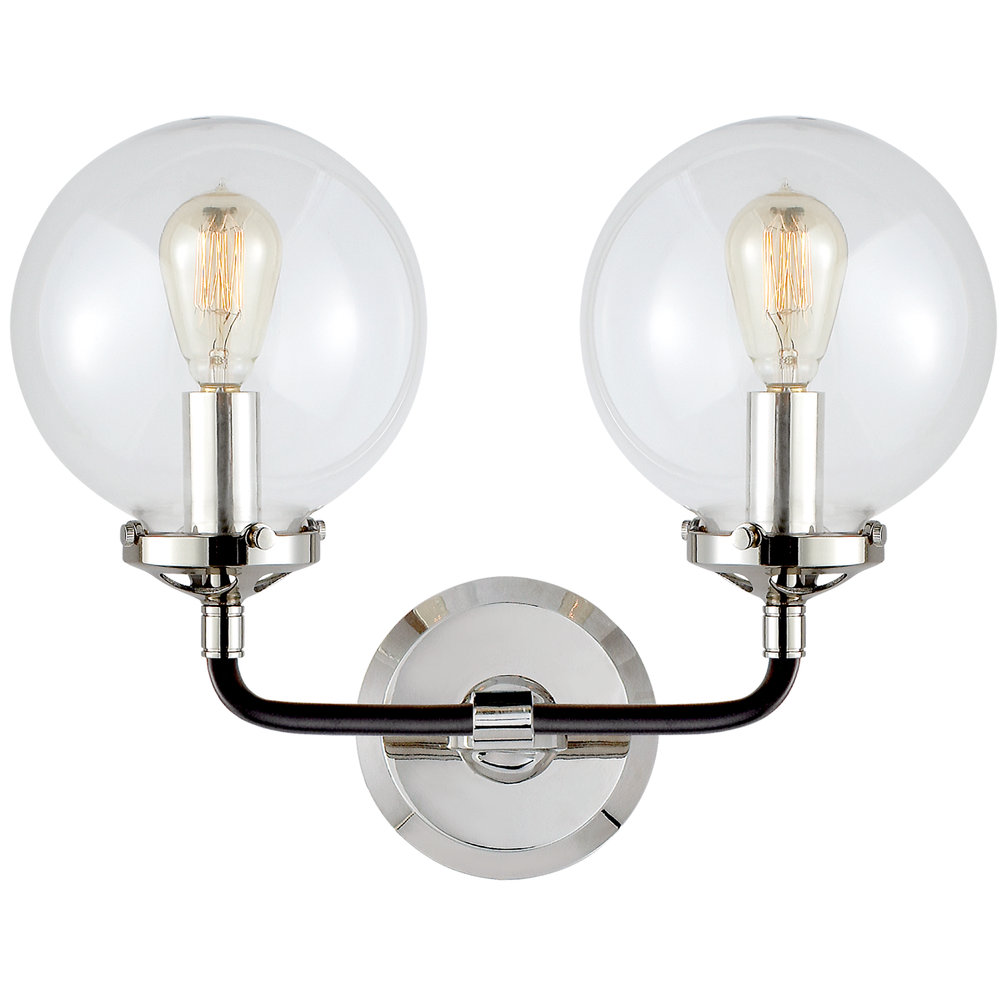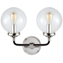 Give your space an industrial edge with the Bistro Clear Glass Bath Bar by Visual Comfort. Its unique design features a series of spherical Clear glass shades supported by a shared wallplate, dramatically curved stems, and metal holders with knob accents. Once lit, inner decorative Edison bulbs create a warm, relaxing ambiance ideal for bathroom settings. Founded in 1987 by Andy Singer, Visual Comfort has years of experience collaborating with world-renowned artisans and has accumulated a diverse collection of quality products. The Visual Comfort collection, including pendants, chandeliers, floor lamps and outdoor lights, incorporates natural materials and distinctive hand-applied finishes, creating a unique look and ambiance that leaves a long lasting impression. Glass or Polished nickel and Black with Clear Height: 10.75 Width: 14 Extension: 7 Backplate: 4.5 Round The Bistro Polished Nickel Bathbar is available with the following: Details: Spherical glass shades Knob accents Decorative Edison bulbs Can be installed as up or downlight Designed by Ian K. Fowler Material: Metal Shade Material: Glass ETL Listed Damp Made In China Options: Base Finish: Polished Nickel, Polished Nickel with Black Trim Number of Lights: 2, 4 Lighting: 2 Light Option: Two 40 Watt (135 Lumens) 120 Volt E26 Medium Base Incandescent Lamp(s) (Not Included)