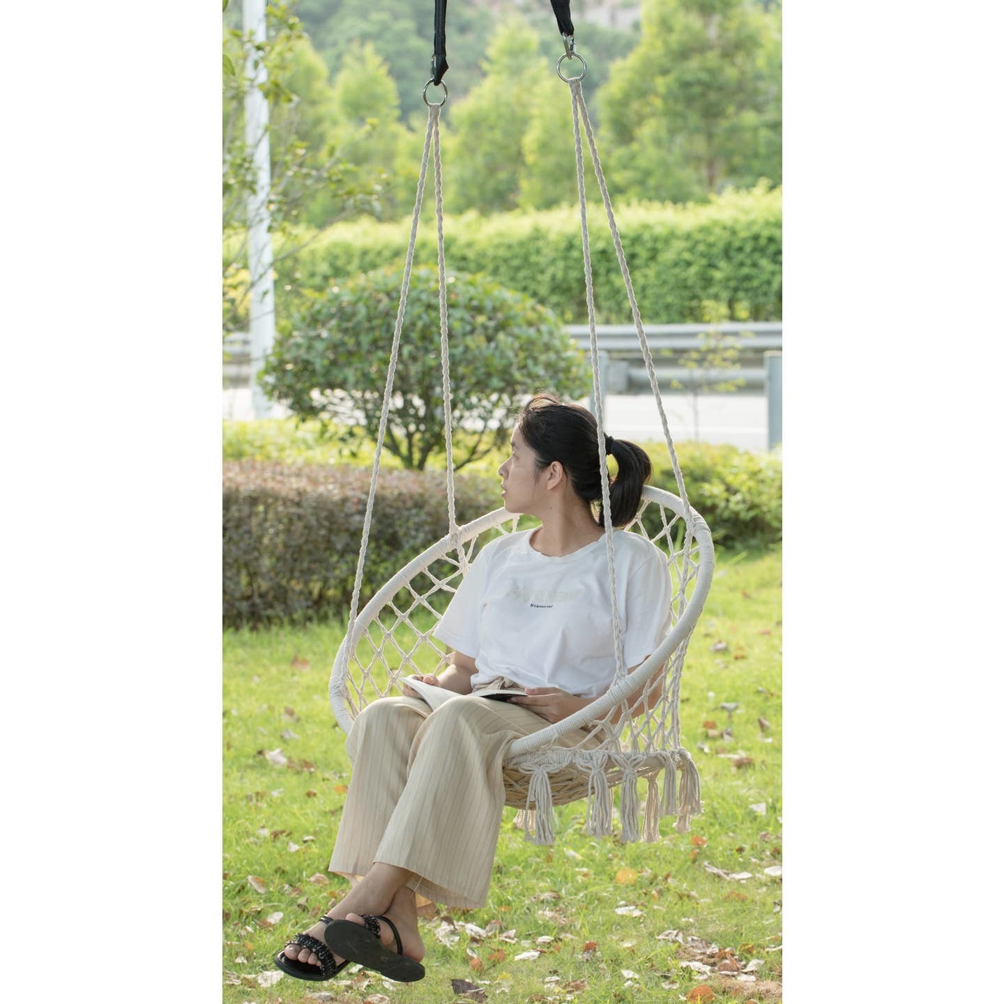 Dimensions: 31.75 Dia, 18 H Ideal for hanging on tree, porch, branch or from the ceiling inside of a room Bohemian chic hammock macrame net chair pattern with fringe tassels Composed out of durable cotton rope material can hold up to 220 pounds Lightweight and compatible design makes it easy to store and carry Add decor to your bedroom, living room, garden, or yard with this hammock swing. Bohemian chic macrame net chair pattern with fringed tassels will add a unique touch to your home decor. Composed out of durable cotton rope material that offers comfort and softness, can hold up to 220 pounds. Lightweight and compatible design makes it easy to store and carry. Rest under sunset, lounge on the desk or relax poolside!