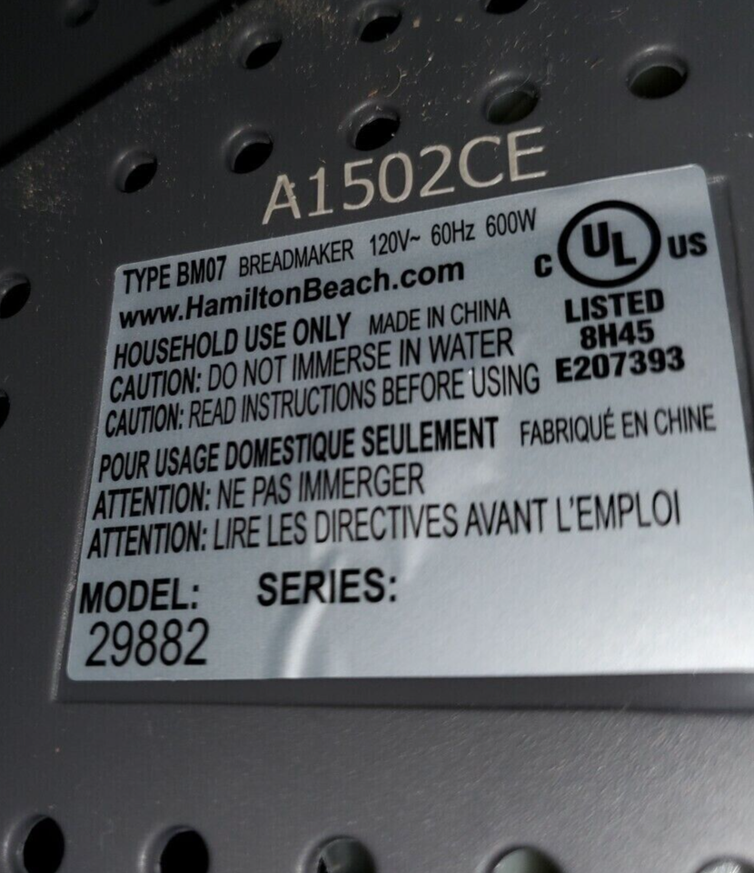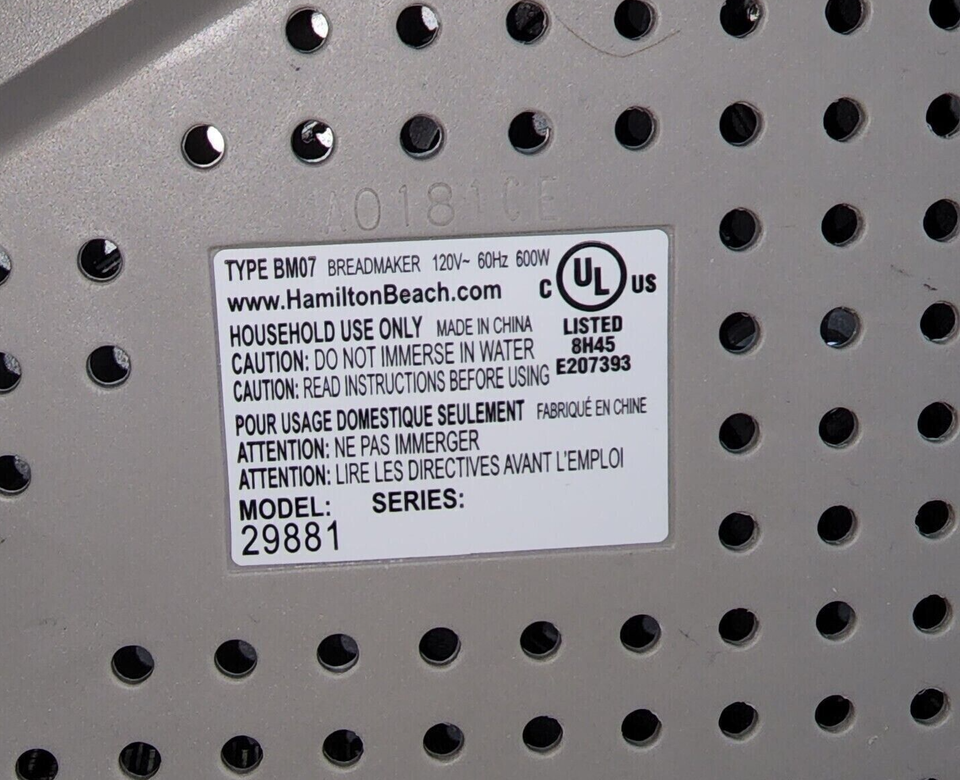 Hamilton Beach Breadmaker Model 29881 29882 29882C |