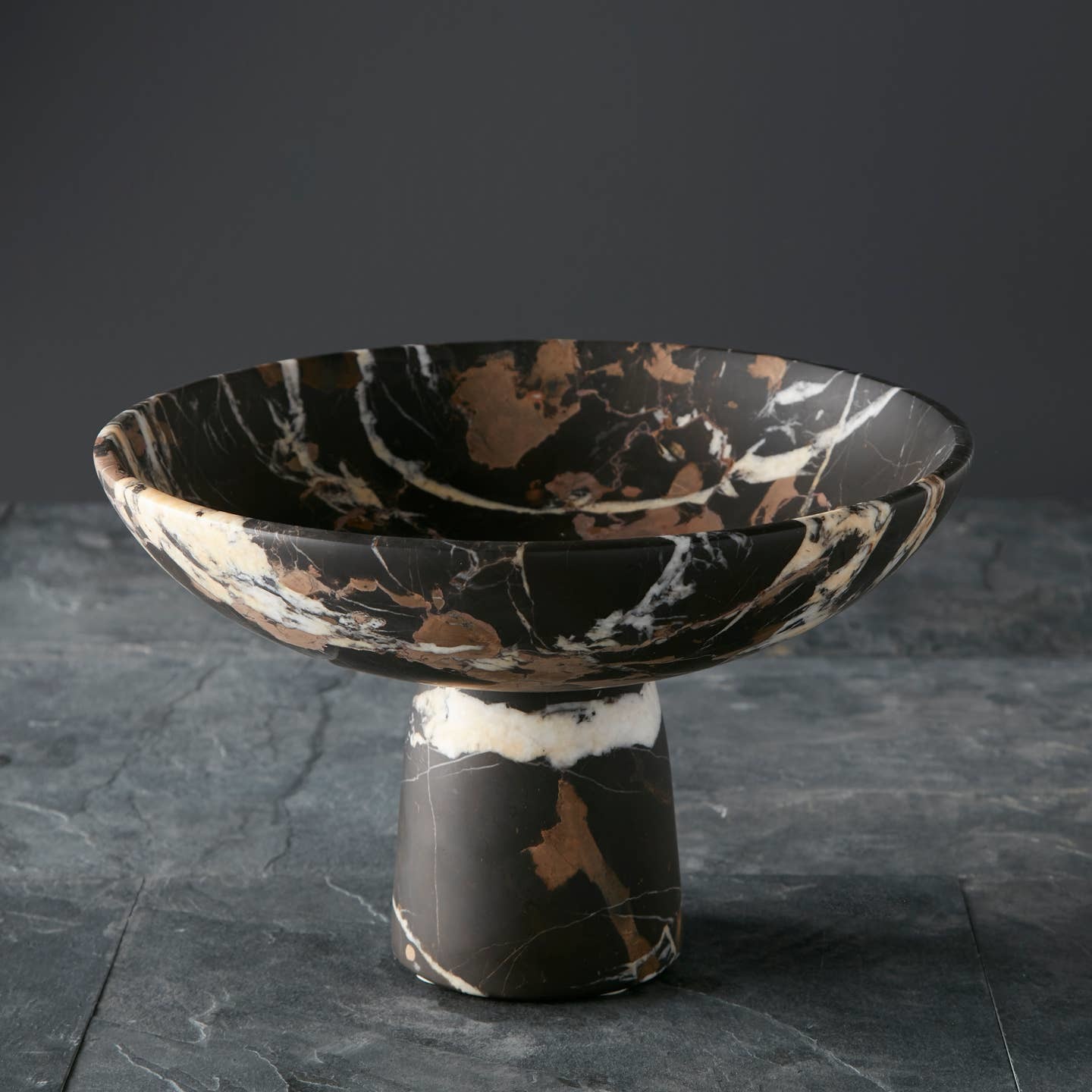 Rhea Collection 12" Black and Gold Marble Honed Finish Footed Bowl
