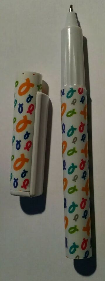 This is a lusting for 2 new cancer awareness ball point black ink writing pens. Easy on and off top. The ribbon colors on the pen are orange, blue, teal, green, pink, gray, purple.