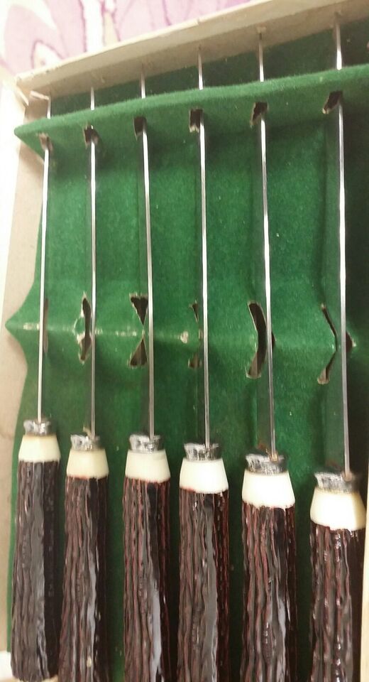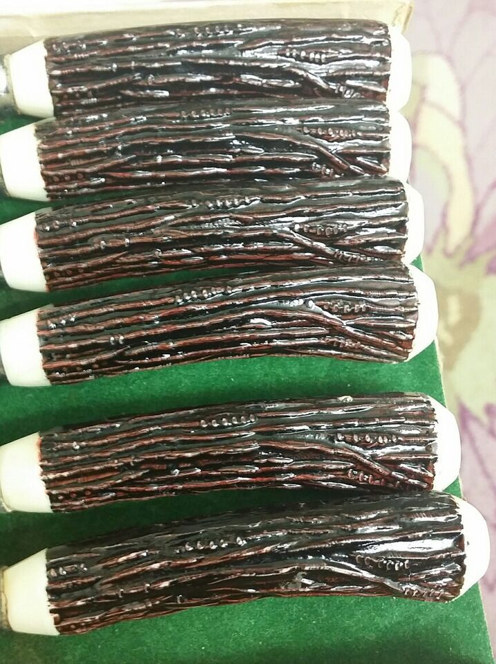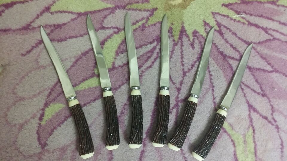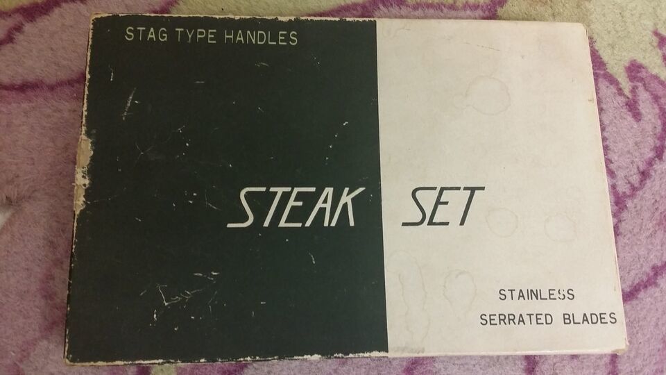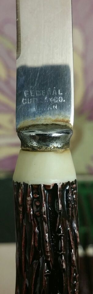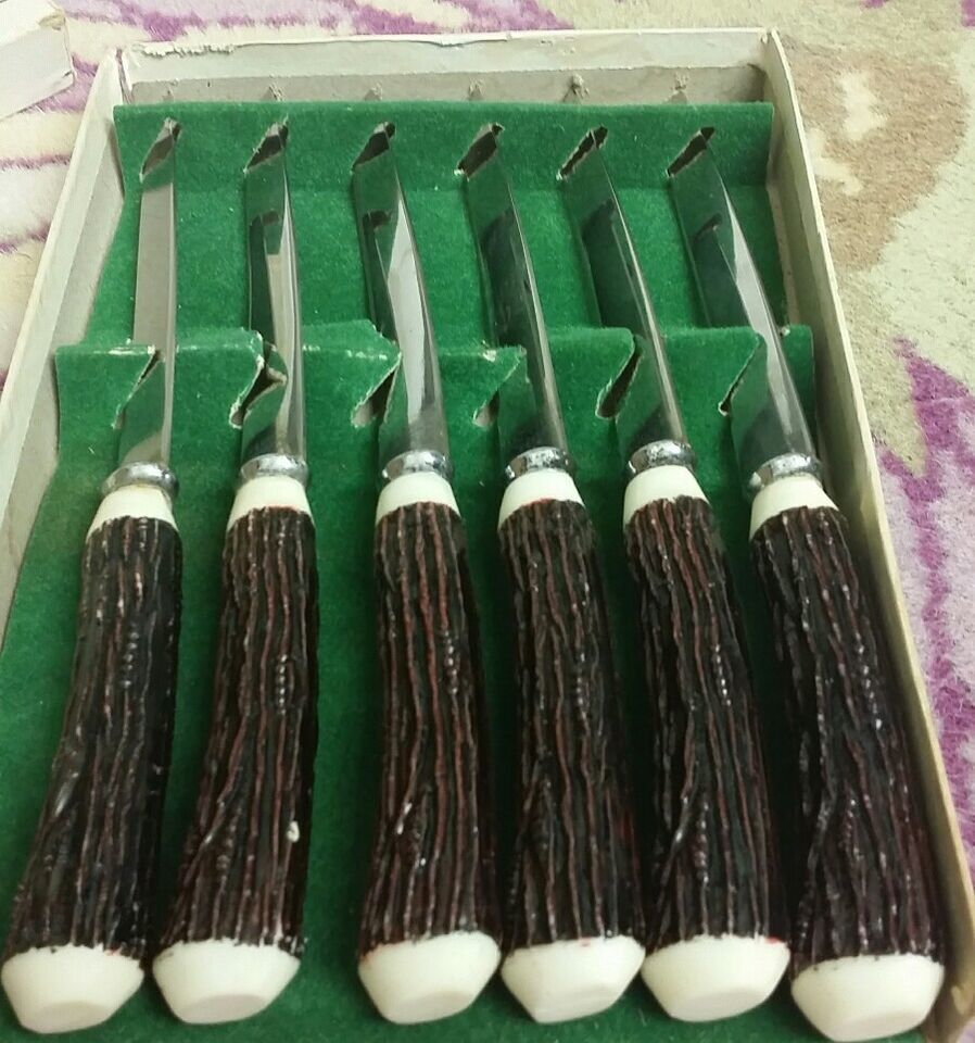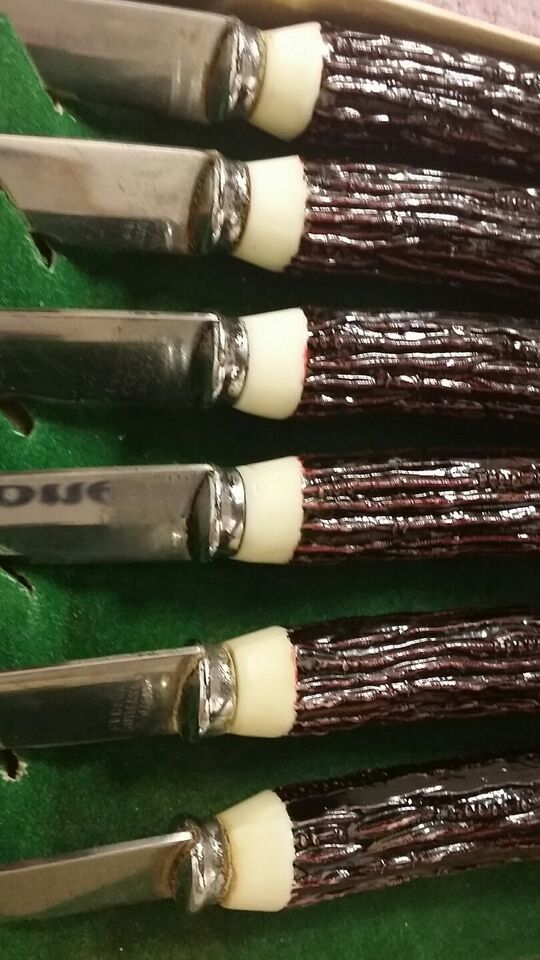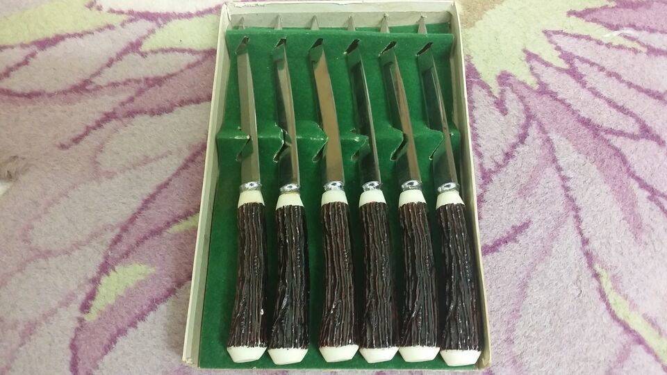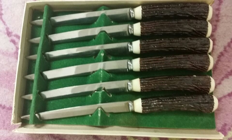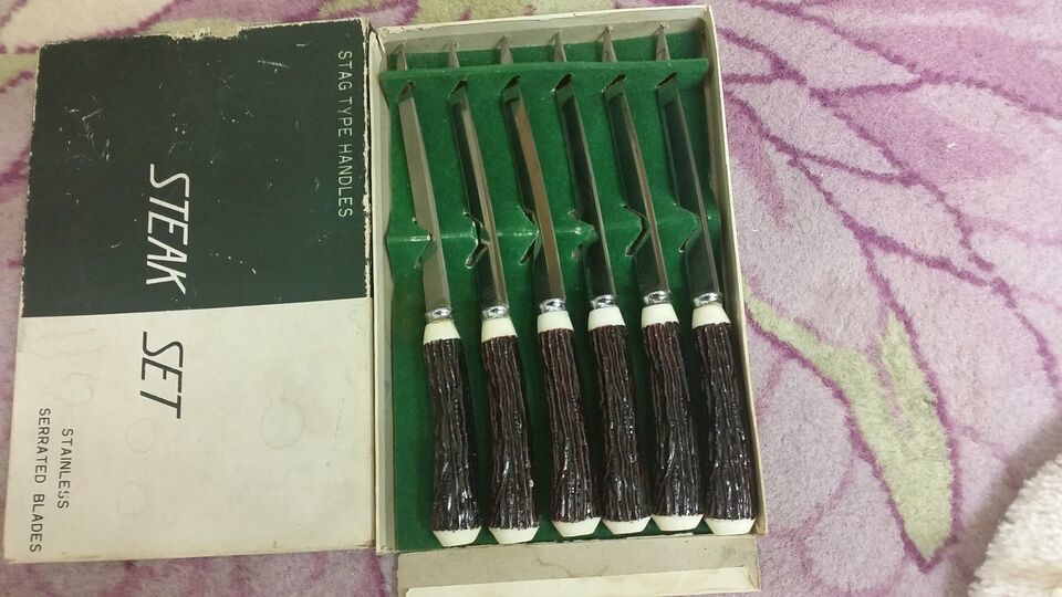 This is a pre-owned set of 6 Federal Cutlery vintage stag type handles steak knives with the original manufacturer's box as pictured.