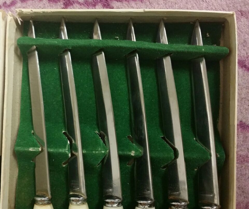 These knives have never been used. Each knife is 8-1/4" in length, made of stainless steel and has a serrated blade. They have been in the drawer for many years and the box is worn out with stains, tears and a side of the box is torn off but is being held together by tape. I just took the original manufacturer's tissue paper off of each knife to take pictures.