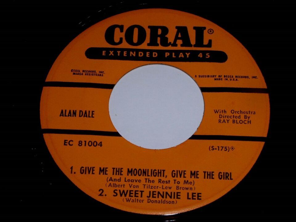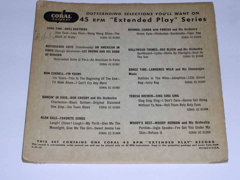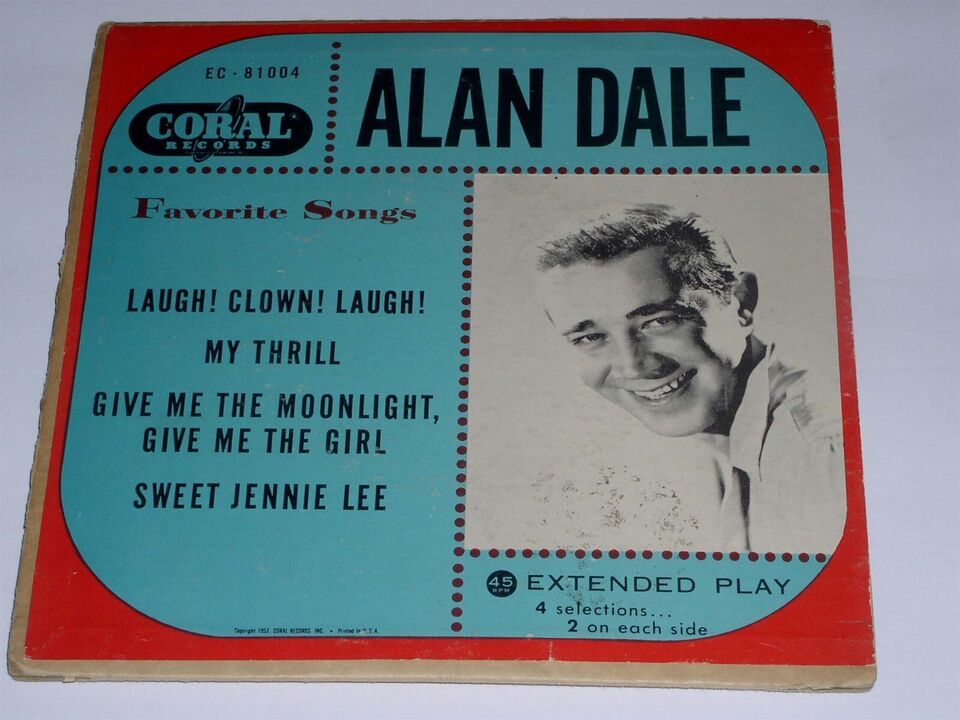 This is an original, vintage 45 rpm extended play phonograph record by Alan Dale entitled, "Favorite Songs". Record label Coral EC-81004. Comes with the original cardboard picture cover as shown.