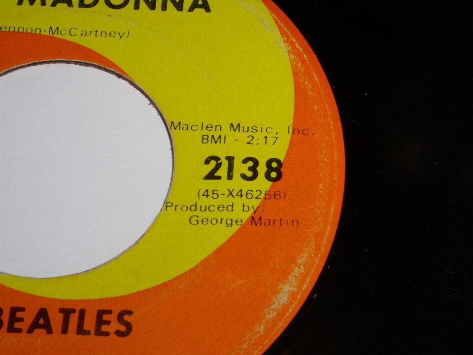 This is a vintage 45 rpm phonograph record by The Beatles, entitled, "Lady Madonna". Flipside: "The Inner Light". Record label Capitol 2138. Note: Maclen Music, Inc. is on one line, not two as most others. This has an asterisk in the matrix, indicating a Los Angeles release.