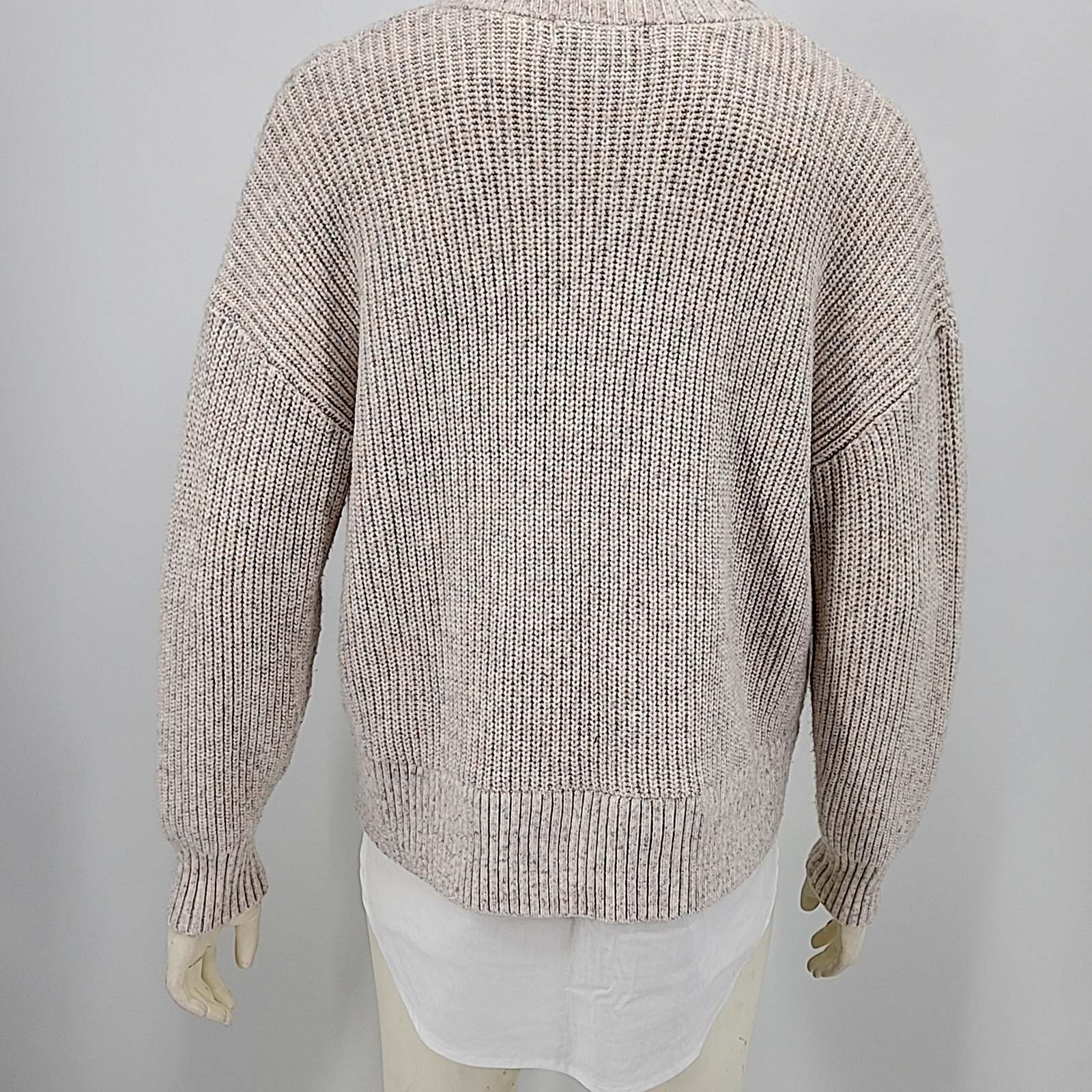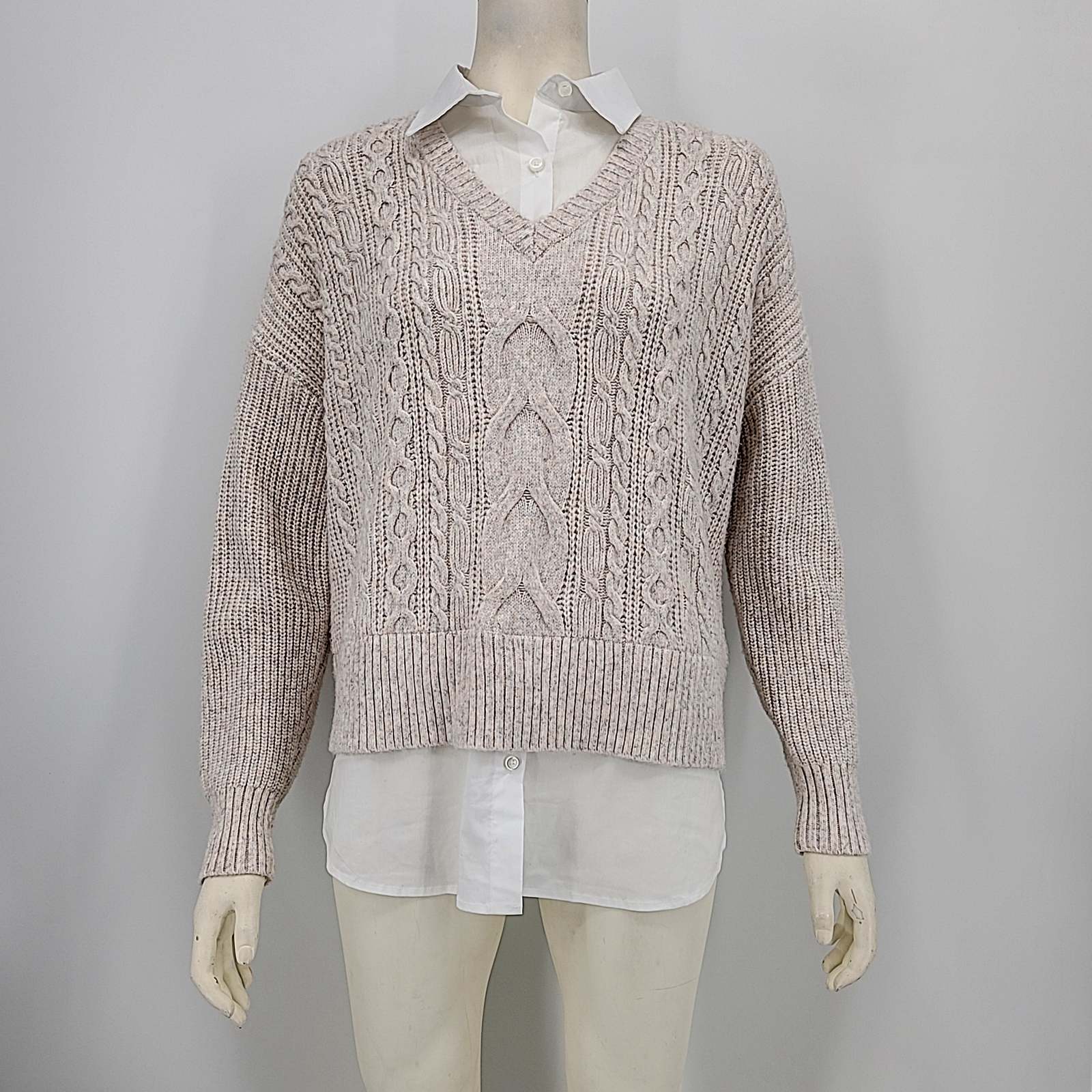Get a layered look with this mixed-media top featuring a long-sleeve woven shirt with a cozy cable-knit body. Slips on over head Spread collar Long sleeves 52% Polyester, 6% nylon 42% Rayon Machine wash, dry flat Imported