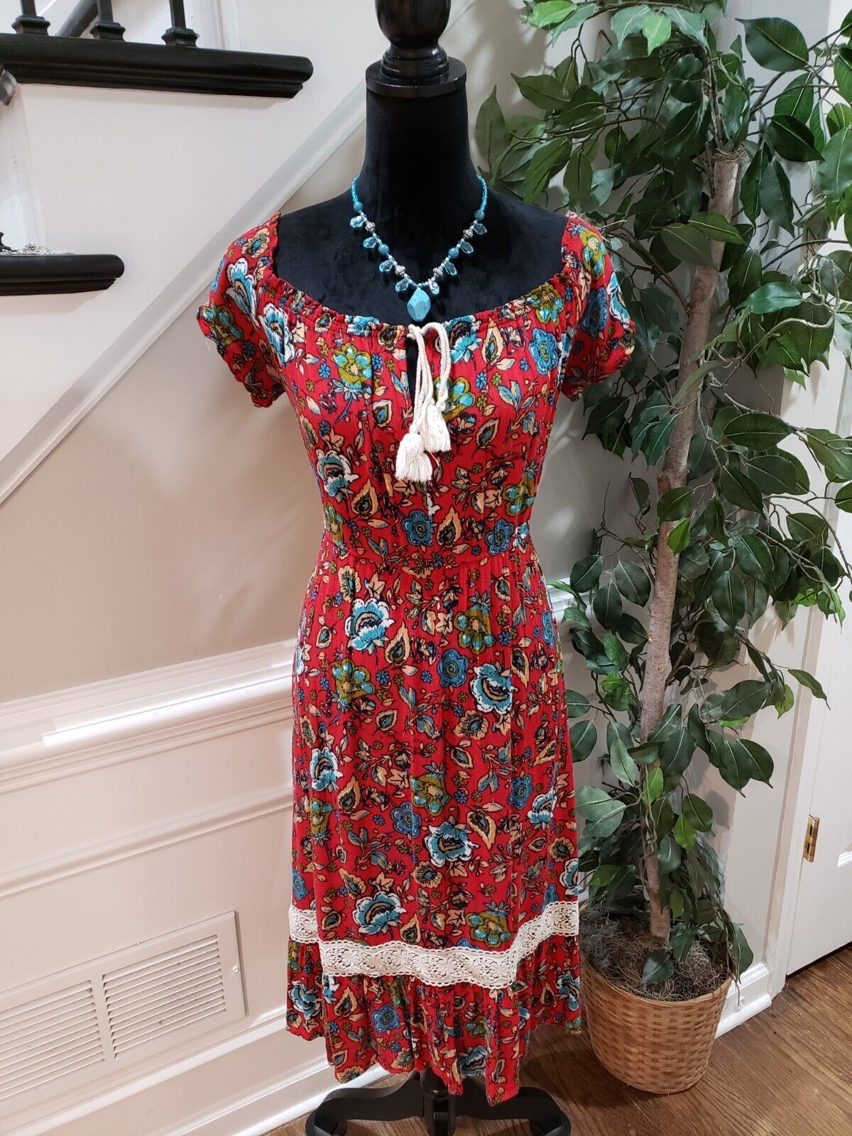 FOREVER 21 Women Red Floral Boho Prairie Farmer Midi Length Dress Size Small