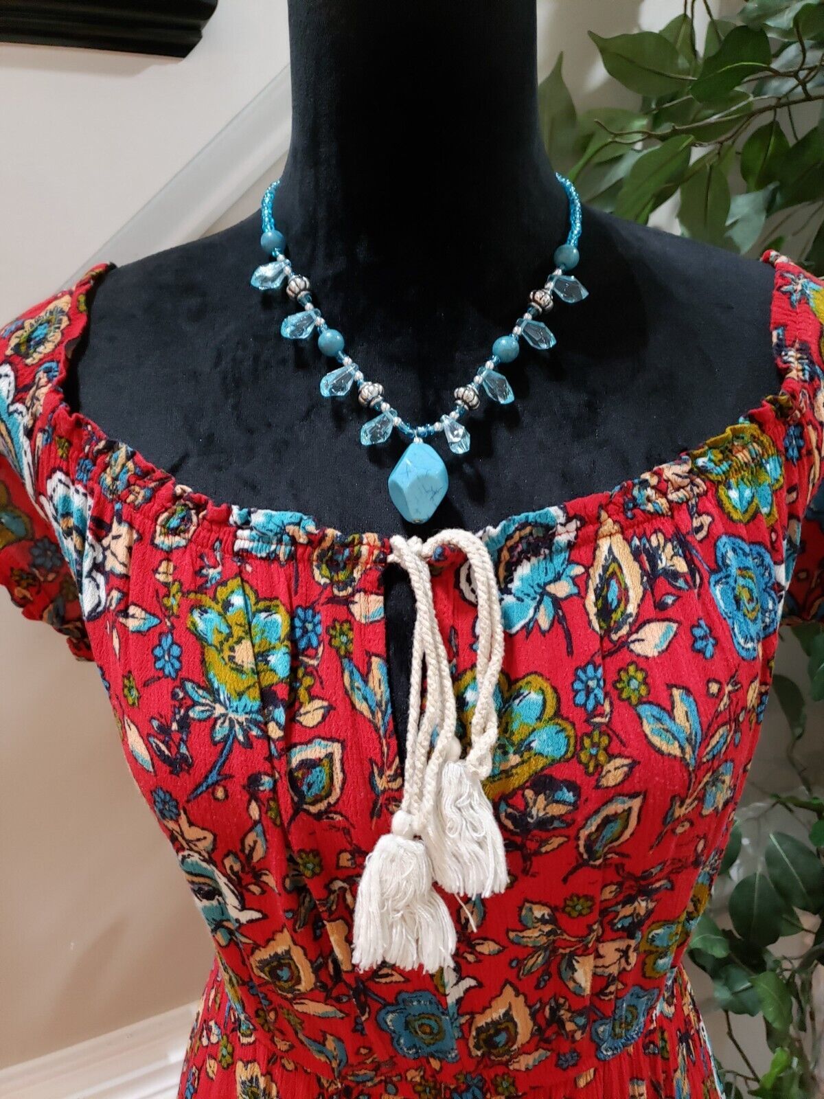 Made from 100% Rayon, this dress is machine washable for easy care. It's collarless design and backless theme make it great for outdoor events. The dress is available in size small and is perfect for women who love boho prairie style.
