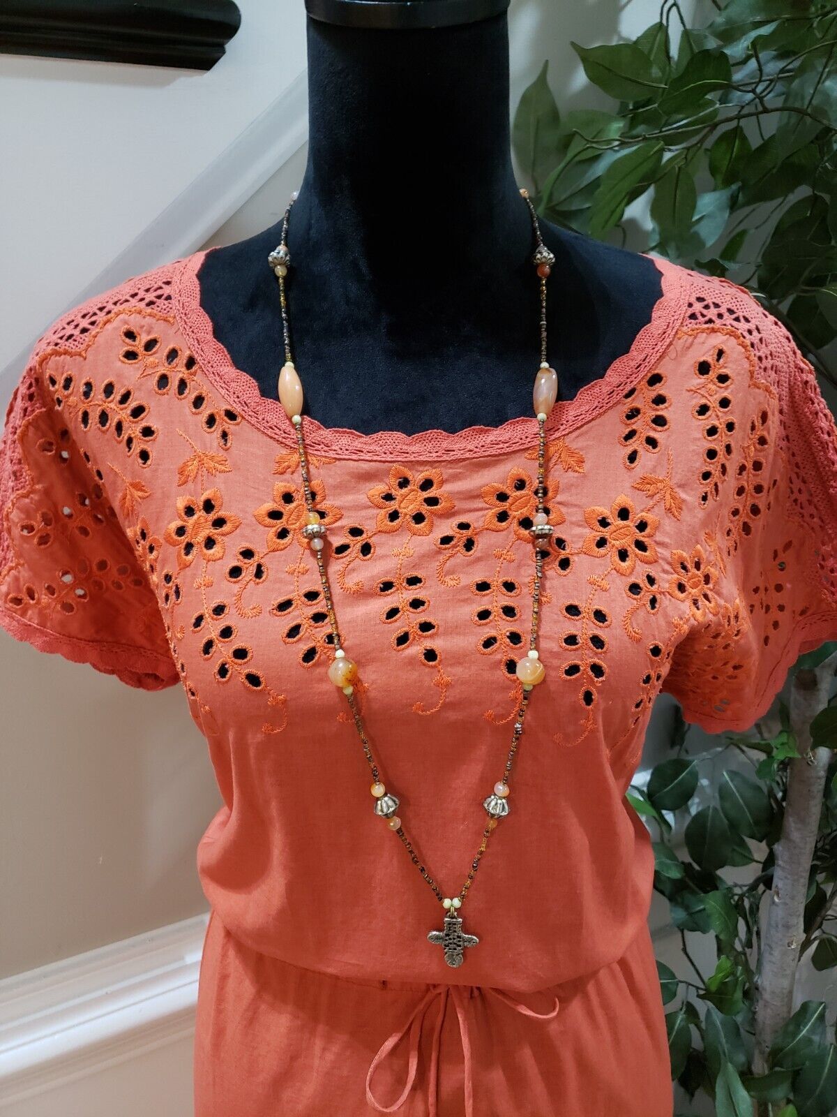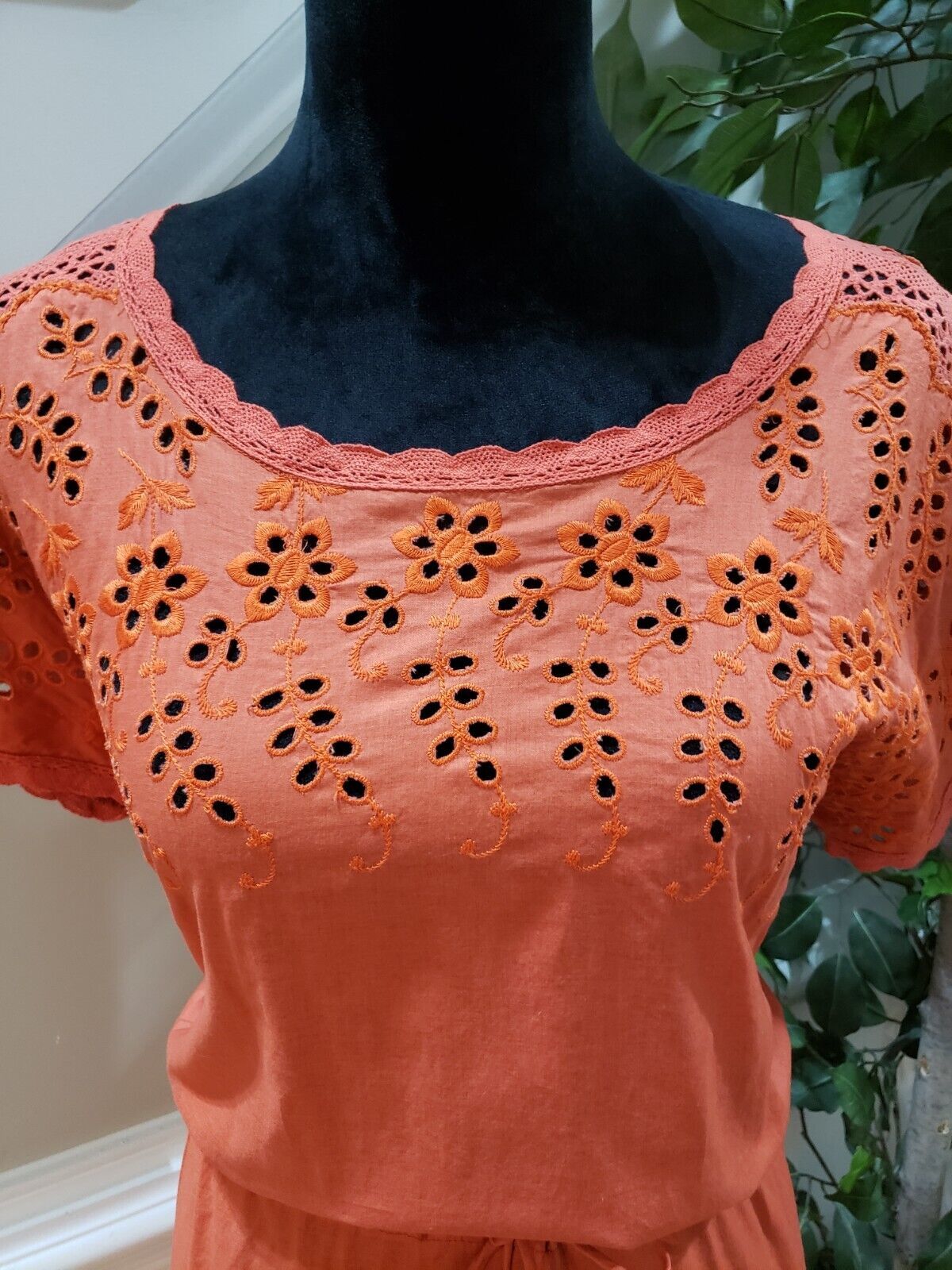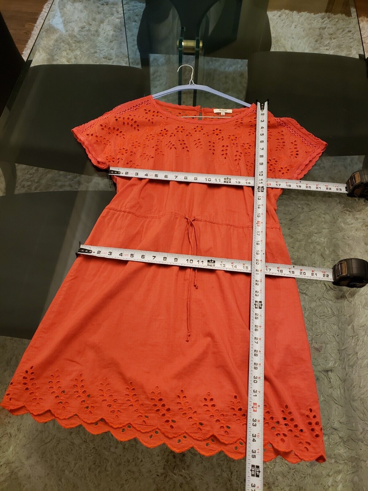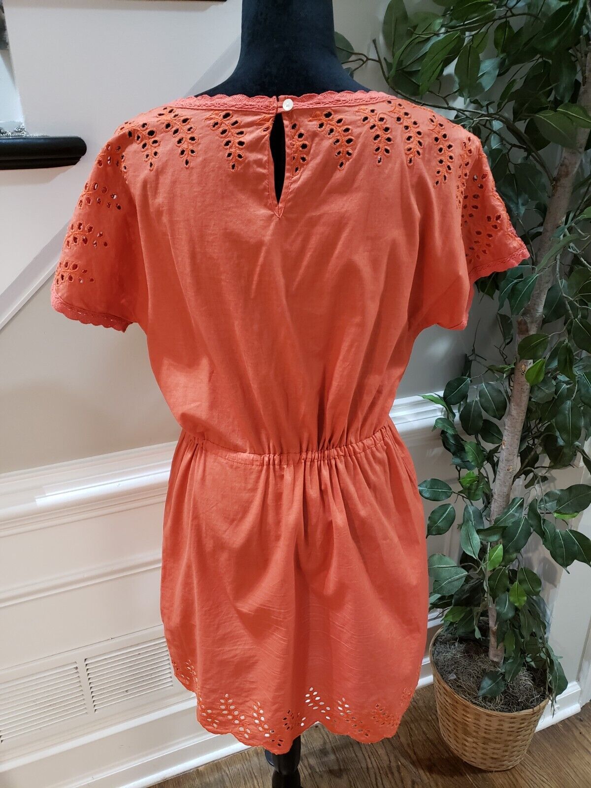 Madewell Women's Orange Drawstring Waist Eyelet Round Neck Fit Flare Dress 4