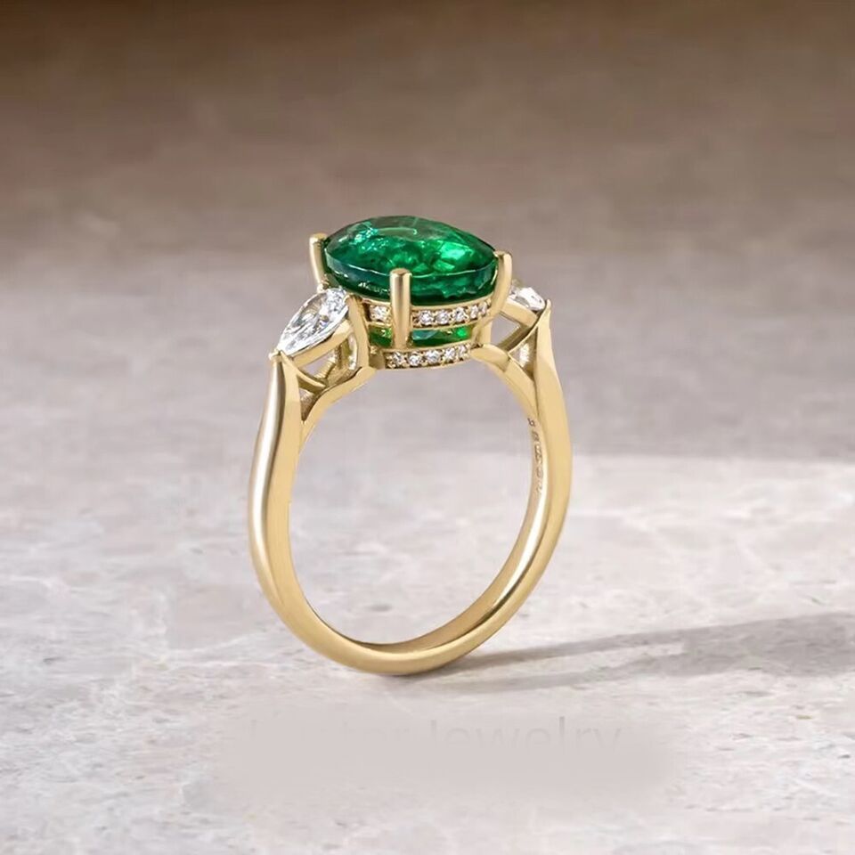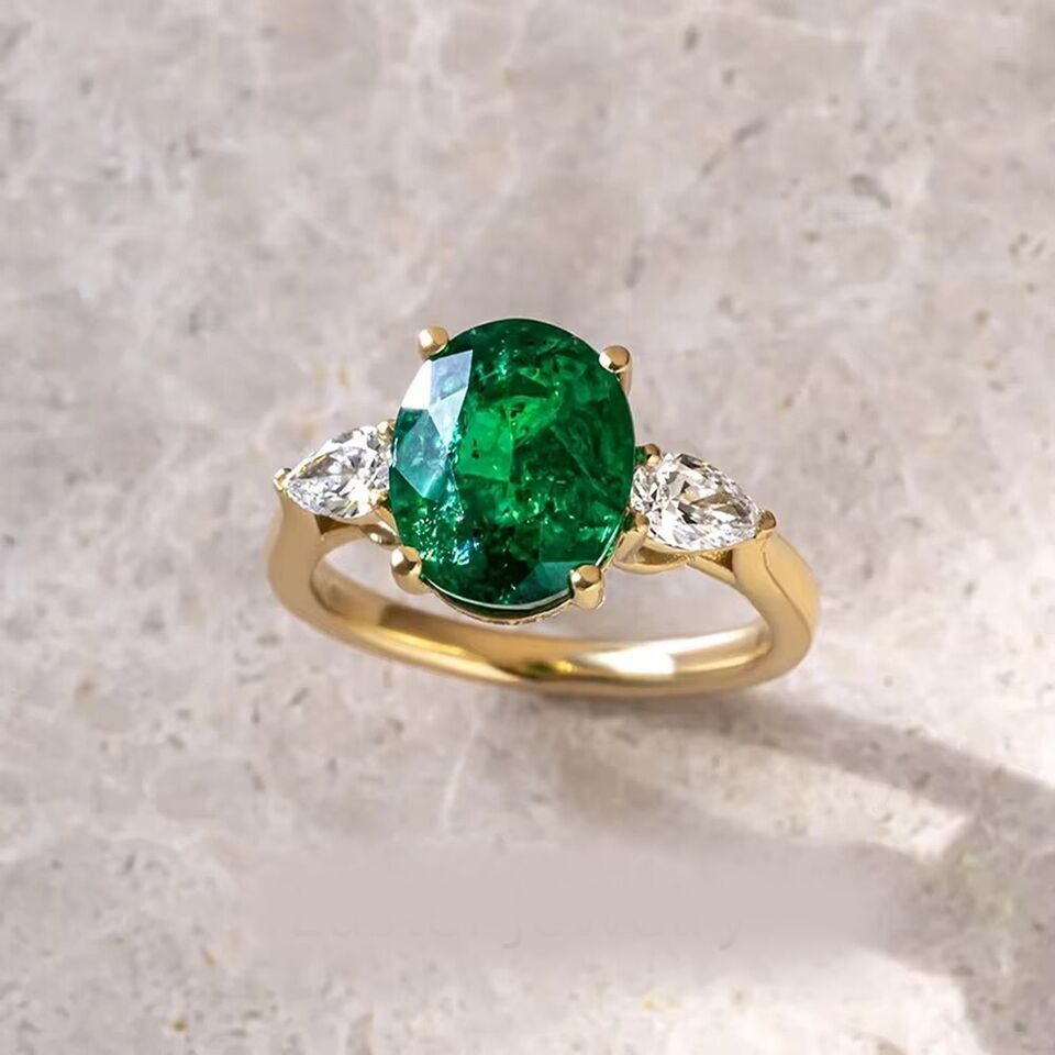 3Ct Lab Created Emerald & Diamond 14K Yellow Gold Plated 3 Stone Engagement Ring