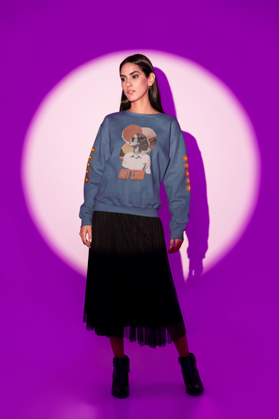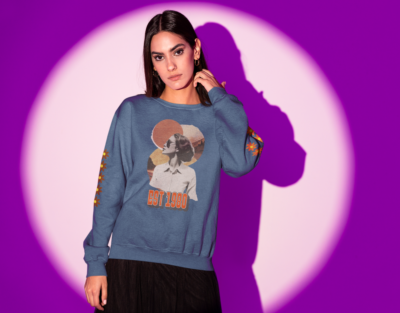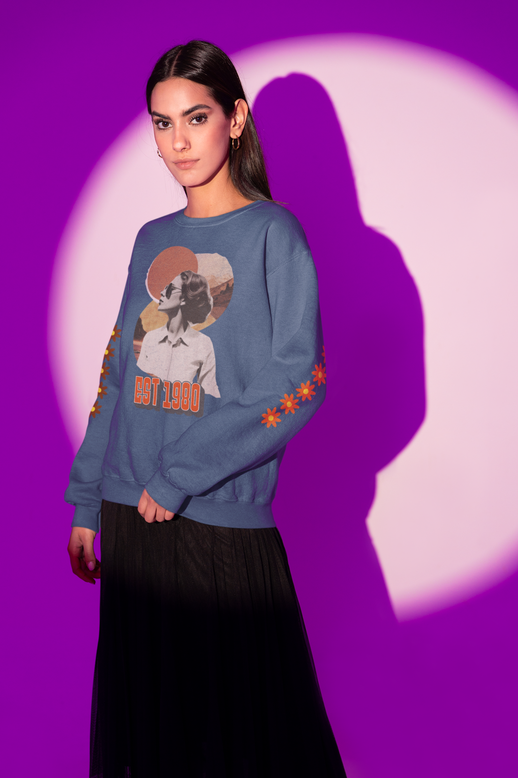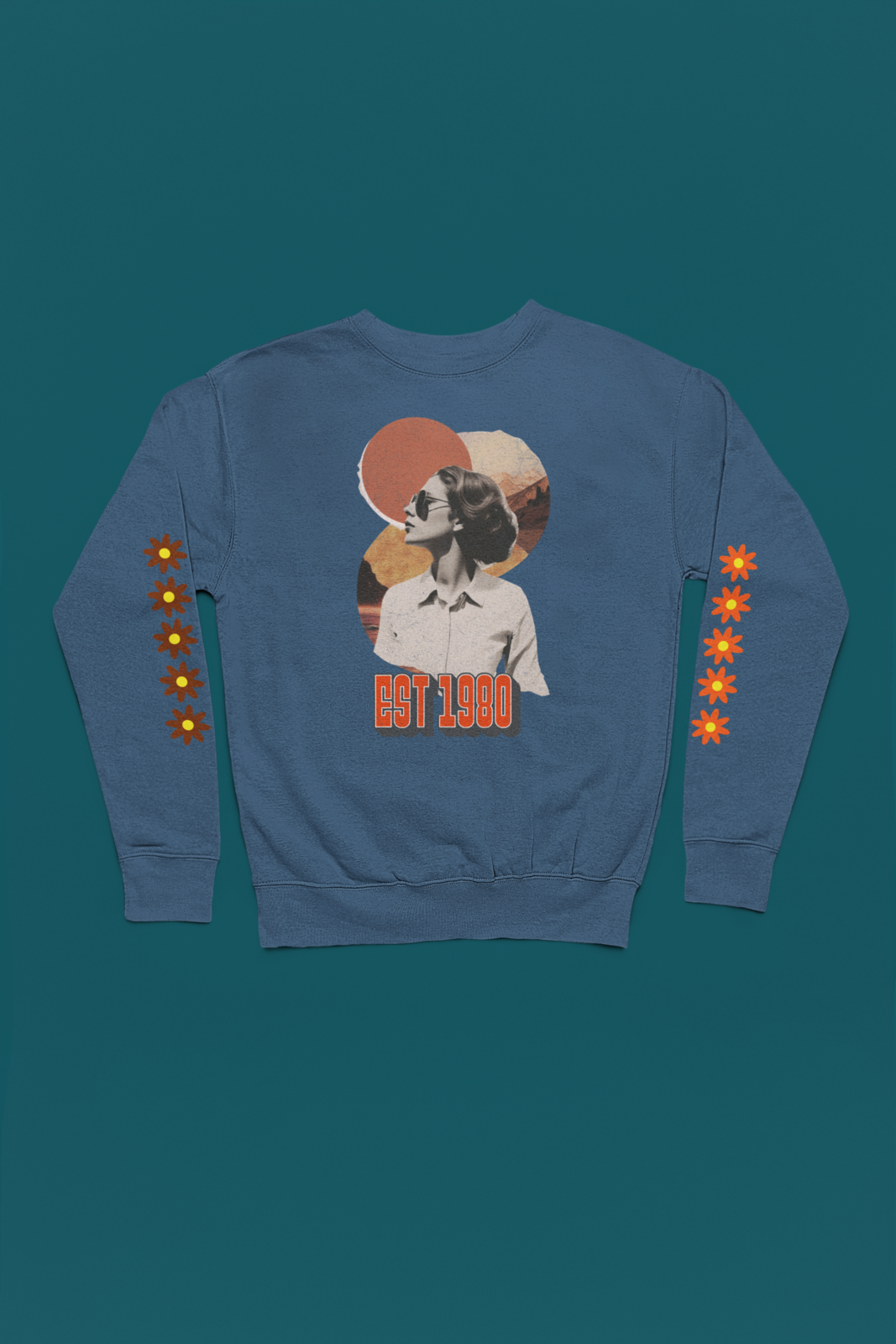 We have created this design thinking about your great style, surrounding it with retro-style flowers, with a lady from the 80s era wrapped in the colors of the eternal best retro years.