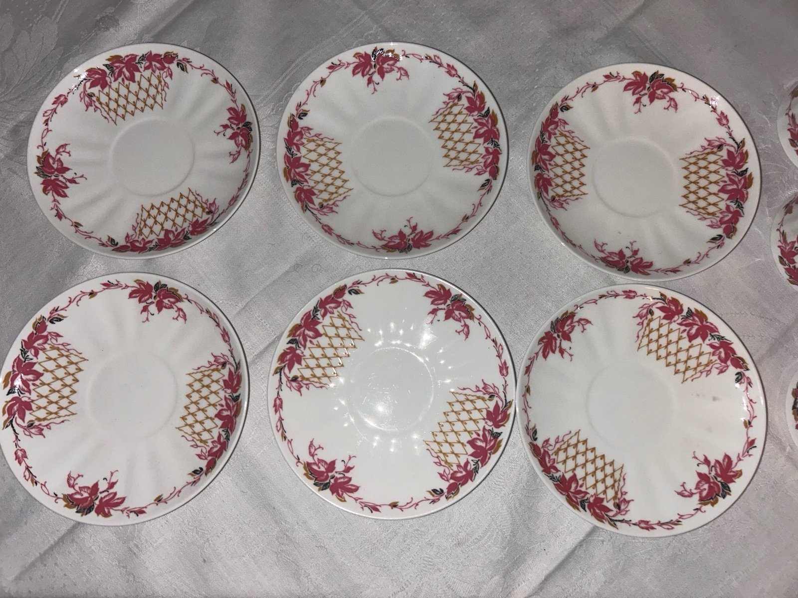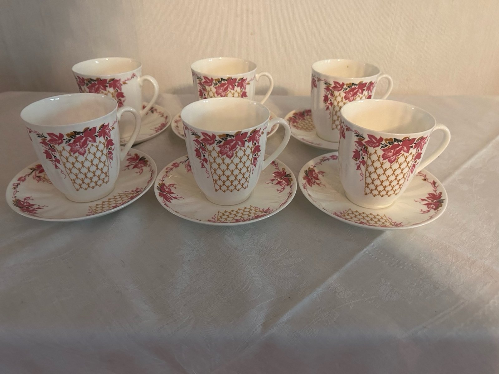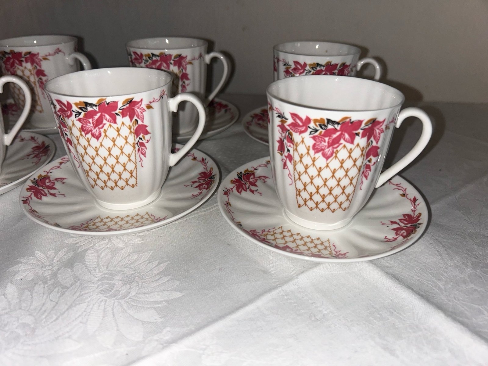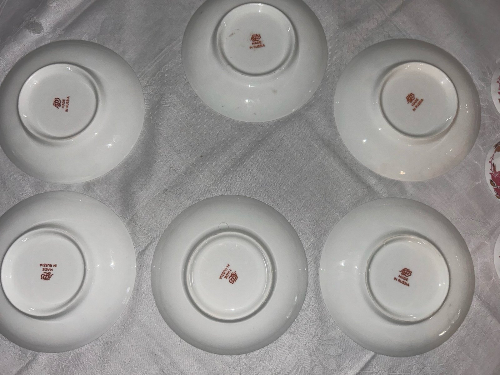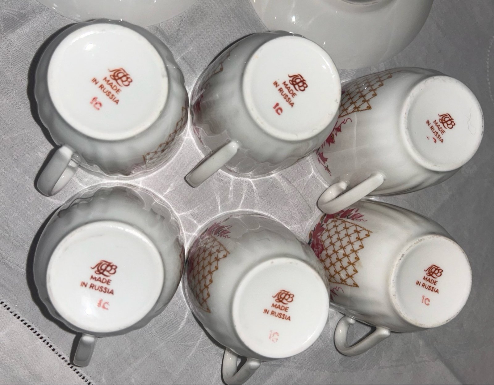 Six fine coffee cups from Lomonosov, St. Petersburg. Bought during the 1990s in Russia. Nice thin porcelain. The height of the cup is 7.5 cm and the diameter of the saucer is 12.5 cm