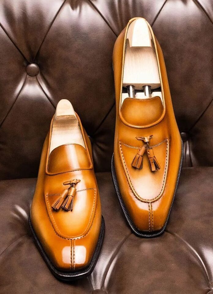 Handmade Men's Tan Tasselled Loafer Narrow Toe Original Leather Loafer Shoes