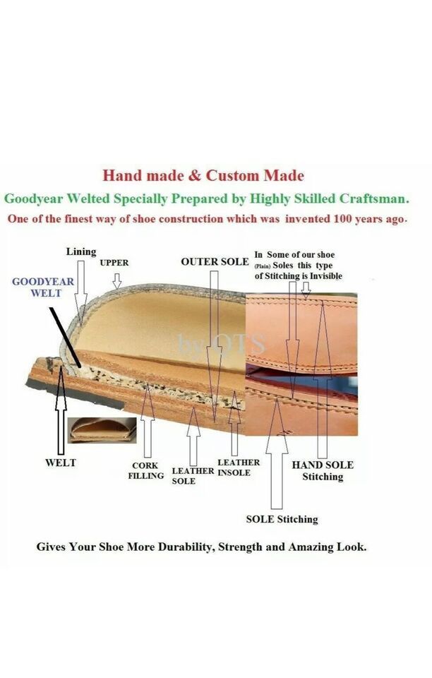 Goodyear Welted Specially Prepared by Highly Skilled Craftsmen. One of The Finest, Way of Shoe Construction. Which was invented a hundred years ago, By The American Charles Goodyear? This is The Final Stitching which holds the sole in place. This Technique allows Complete Removal of The Sole, Without Damaging the Upper. Gives your shoes more Durability, Strength and an Amazing look.