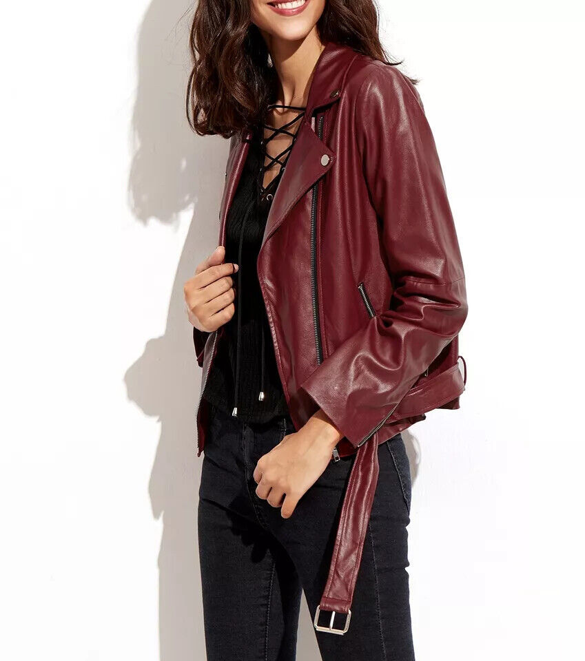 Stylish Decent Burgundy Jacket Womens Slim-fit Genuine Leather Motorcycl Biker / us