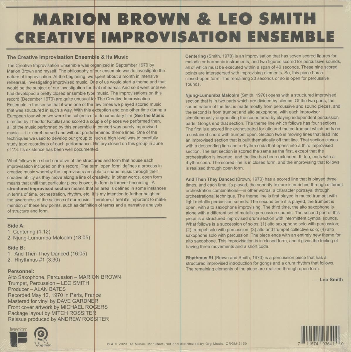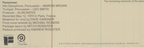 Creative Improvisation Ensemble captures the meeting of two avant-garde giants, Marion Brown and Wadada Leo Smith, on May 12, 1970 in Paris, France. The session finds Brown and Smith on their primary instruments, alto saxophone and trumpet, respectively, with both musicians performing various percussion instruments as well. The release marks the latest edition of Org Music?s Freedom Records reissues series, mastered for vinyl by Dave Gardner and pressed at Pallas Group on transparent red audiophile-grade vinyl. The album has not been pressed on vinyl since its original release in 1975.