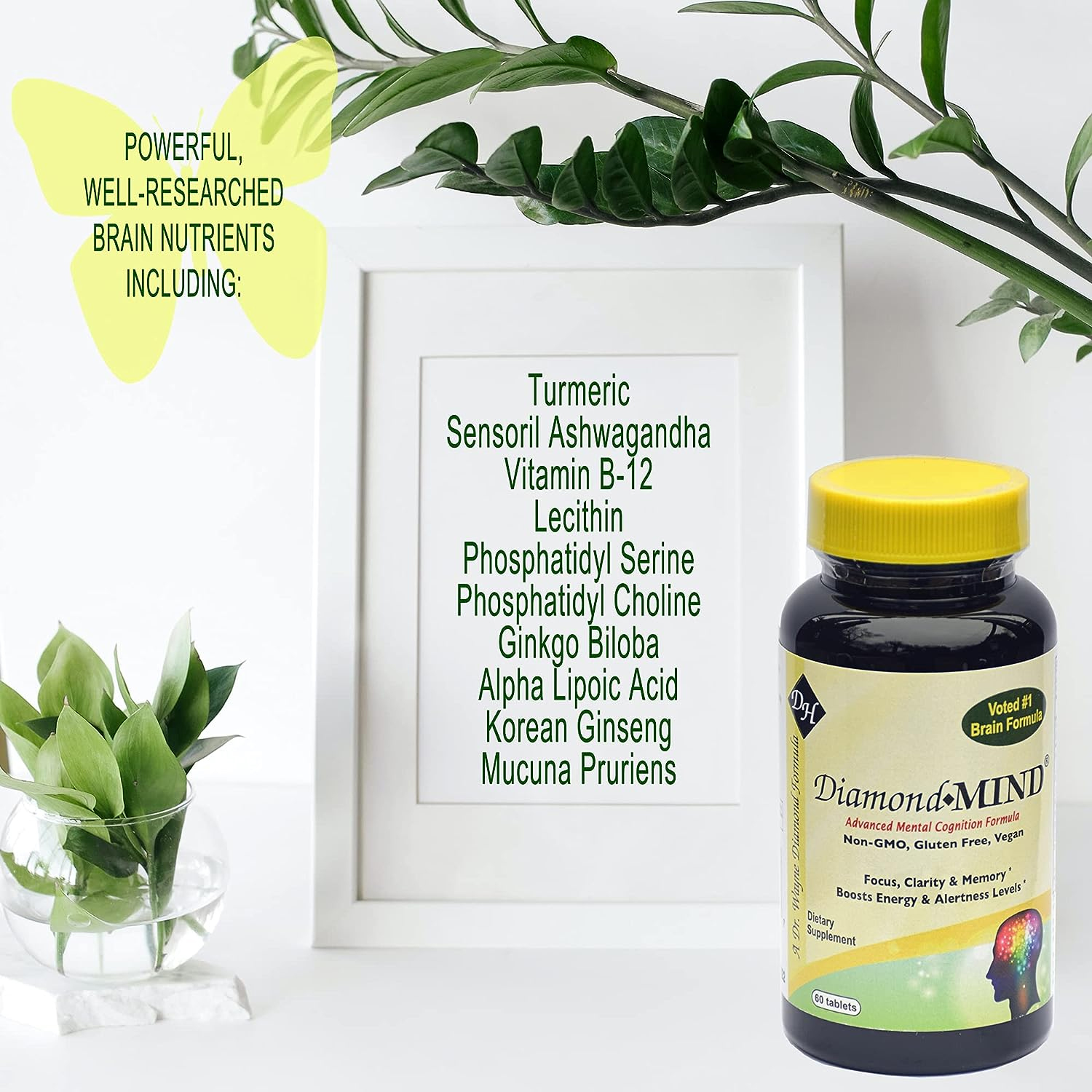 Scientifically Formulated: Researched and developed by Dr. Wayne Diamond, a Philadelphia Naturopath, Psychotherapist, and pioneer in Natural Medicine, DiamondMIND is scientifically formulated to nourish mind and body. Supports Memory and Cognitive Function: Combines well-known, respected, and safe vitamins, herbs, antioxidants, and nutrients to help support stress reduction, mental energy and acuity, focus, concentration, and alertness levels. Clinically Tested Ingredients: Phosphatidyl Serine, Phosphatidyl Choline, Lecithin, Sensoril Ashwaganda, Velvet Bean, Turmeric, Korean Ginseng Root Extract, Alpha Lipoic Acid, Acetyl L-Carnitine HCl, Ginkgo Biloba Leaf, and B12. Award Winning Formula: Recognized winner of Best New Products by Amazing Wellness Magazine 2017, and Best of Supplements by Better Nutrition 2017. Vegan Formulation: Non-GMO, Gluten Free and manufactured in an FDA-licensed facility utilizing the strictest GMP's (Good Manufacturing Practices). Researched and developed by Dr. Wayne Diamond, a Philadelphia Naturopath, Psychotherapist, and pioneer in Natural Medicine, this award winning mind supplement DiamondMIND was first introduced two decades ago. Thrilled clients turn to DiamondMIND's proven and powerful ingredients daily including Phosphatidyl Serine, Phosphatidyl Choline, Lecithin, Sensoril Ashwaganda, Velvet Bean, Turmeric, Korean Ginseng Root Extract, Alpha Lopoic Acid, Acetyl L-Carnitine HCl, Ginkgo Biloba Leaf, and B12. DiamondMIND's vegan formulation is gluten free and non-GMO. These important ingredients are clinically tested and/or have been used successfully for centuries. Clinical trials show some ingredients in DiamondMIND may be helpful to boost energy levels, inhibit cellular oxidative stress, and slow the effects of aging from free radicals.