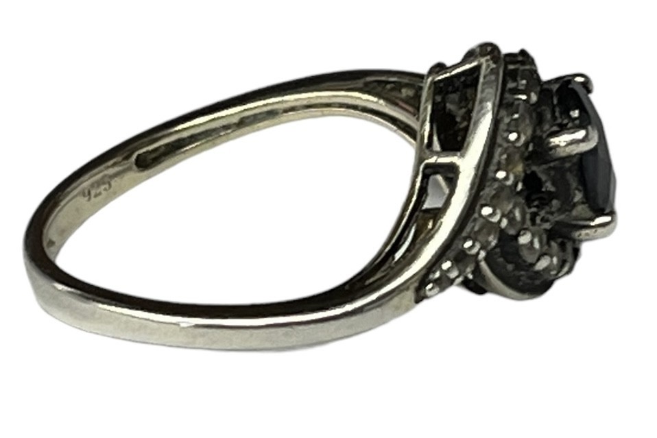 Type: Cluster ringWeight: 1.7Karat: .925Metal: SilverGender: UnisexStyle: ClusterSize / Length: 7Owner applied: PM 925Stone 1 quantity: 1Stone 1 shape: OvalStone 1 color: BlueStone 1 weight (total): .75Stone 2 Quantity: 24Stone 2 Shape: RoundStone 2 Color: ClearStone 2 Weight (Total): 0.24Condition:Used