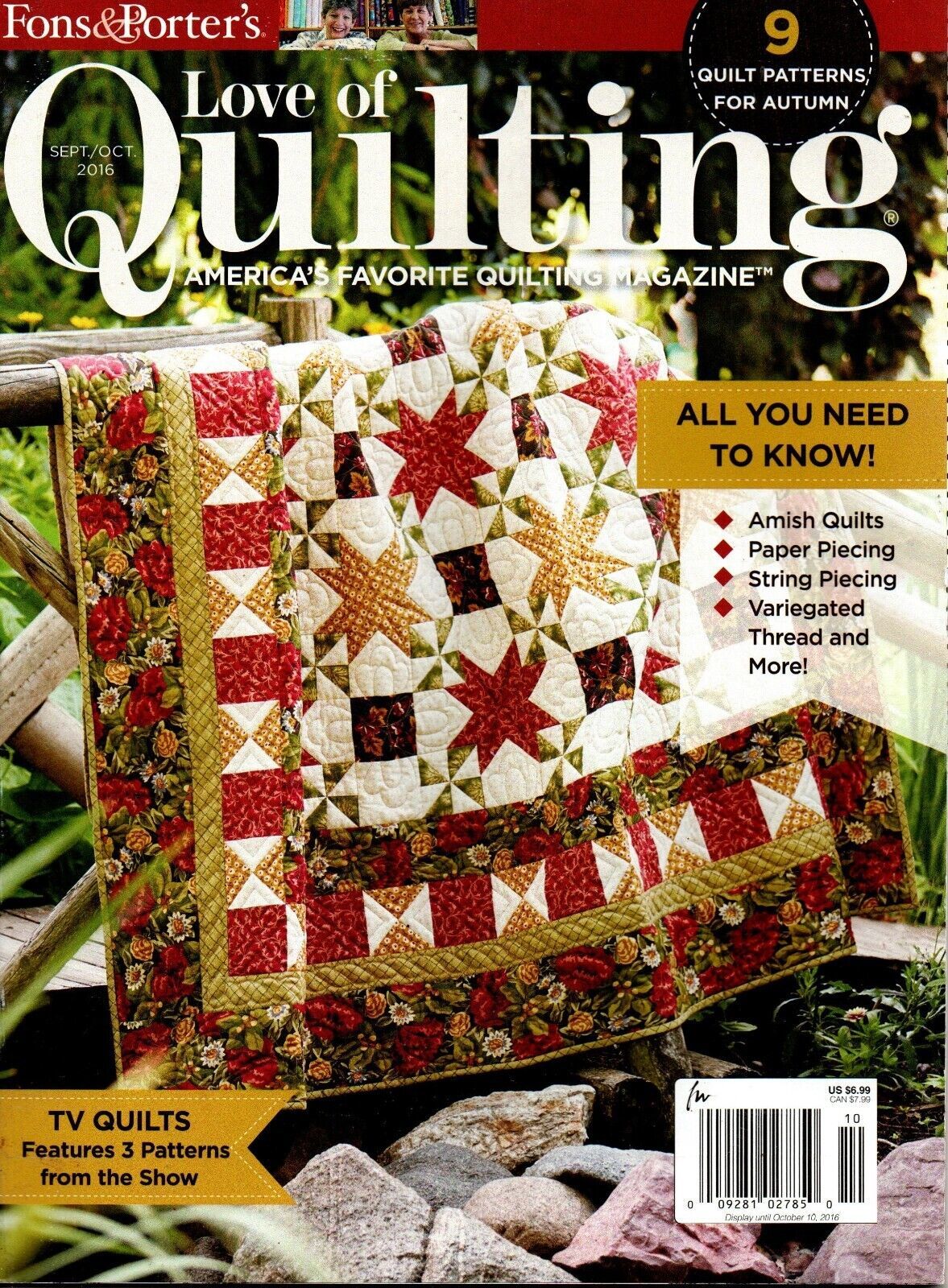 This is an original copy of Love of Quilting Magazine. This is the September/October 2016 issue. The cover has minor shelf wear. The pages are clean. There are no missing or torn pages.