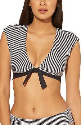 Bleu Rod Beattie Inside The Lines Tie Front Cap Sleeve Swim Top (N21673). Stripe it rich in this cute swim top with a sexy faux tie-front at front and slanted lines that perfectly meet at center back. Made of nylon with spandex for stretch comfort. Wireless cup is lined with breathable pique-knit pockets for removable padding included. Extended shoulder forms a cap sleeve. Deep plunge front has covered elastic at the edge to maintain fit. Contrast solid underband is two-ply microfiber with covered elastic at top for a secure fit. Tie band at center is sewn onto inside underband and ties around it on the outside. Armholes are outlined with covered elastic. Full back with breathable lining. Fabric info tag sewn inside back of neck. Pullover styling.