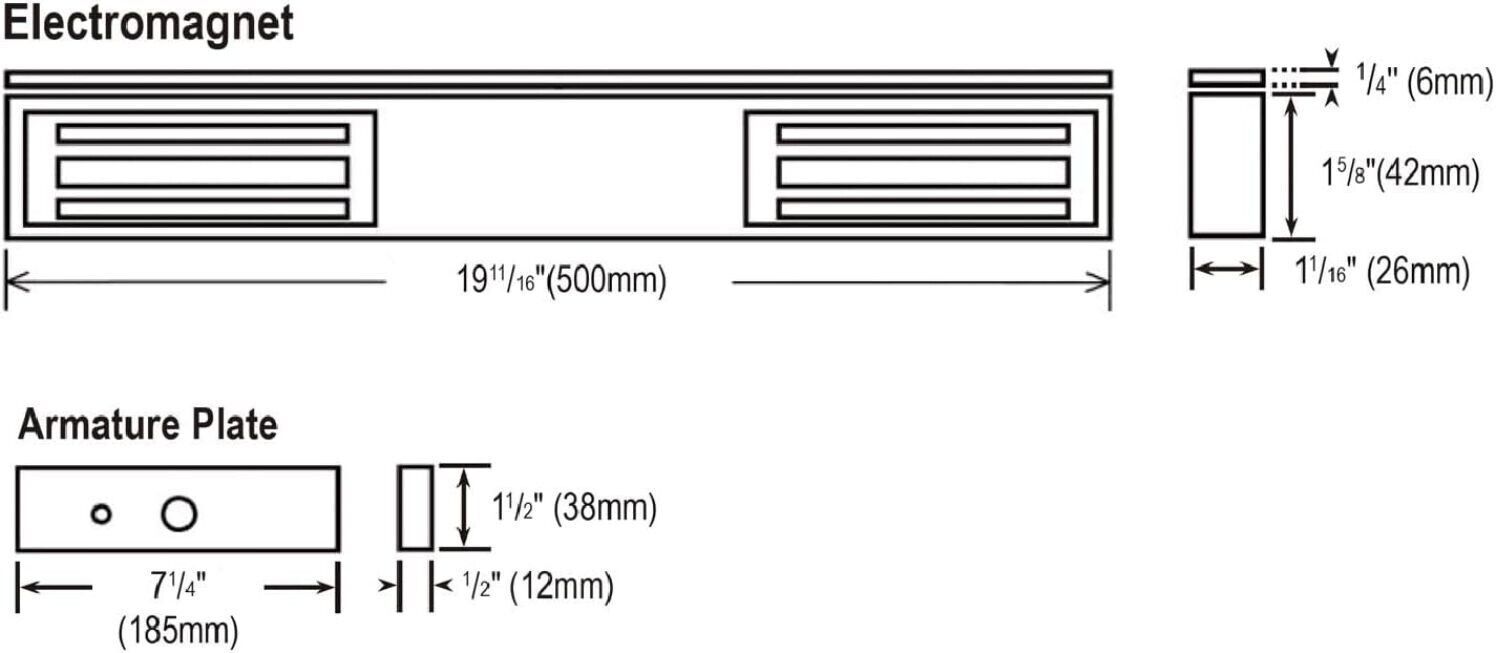 Electromagnet dimensions: 19-11/16" x 1-5/8" x 1-1/16" (500 x 40 x 26 mm)