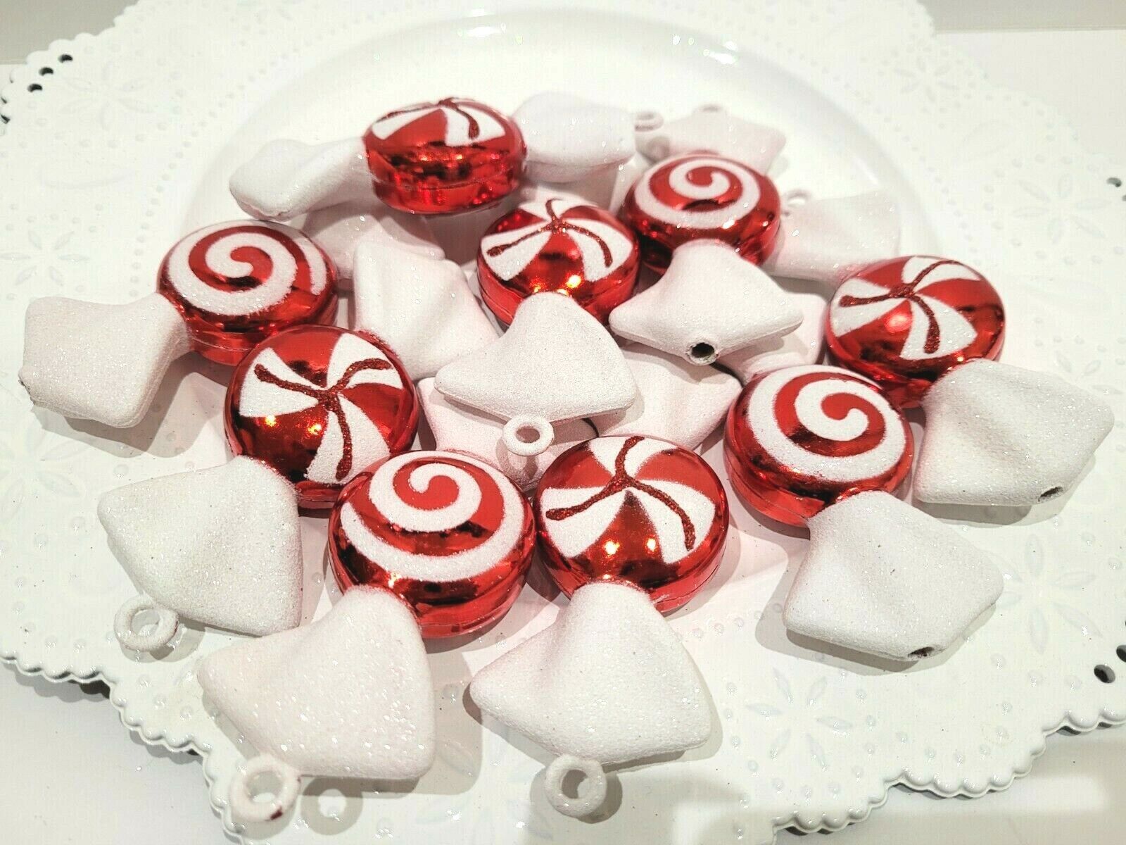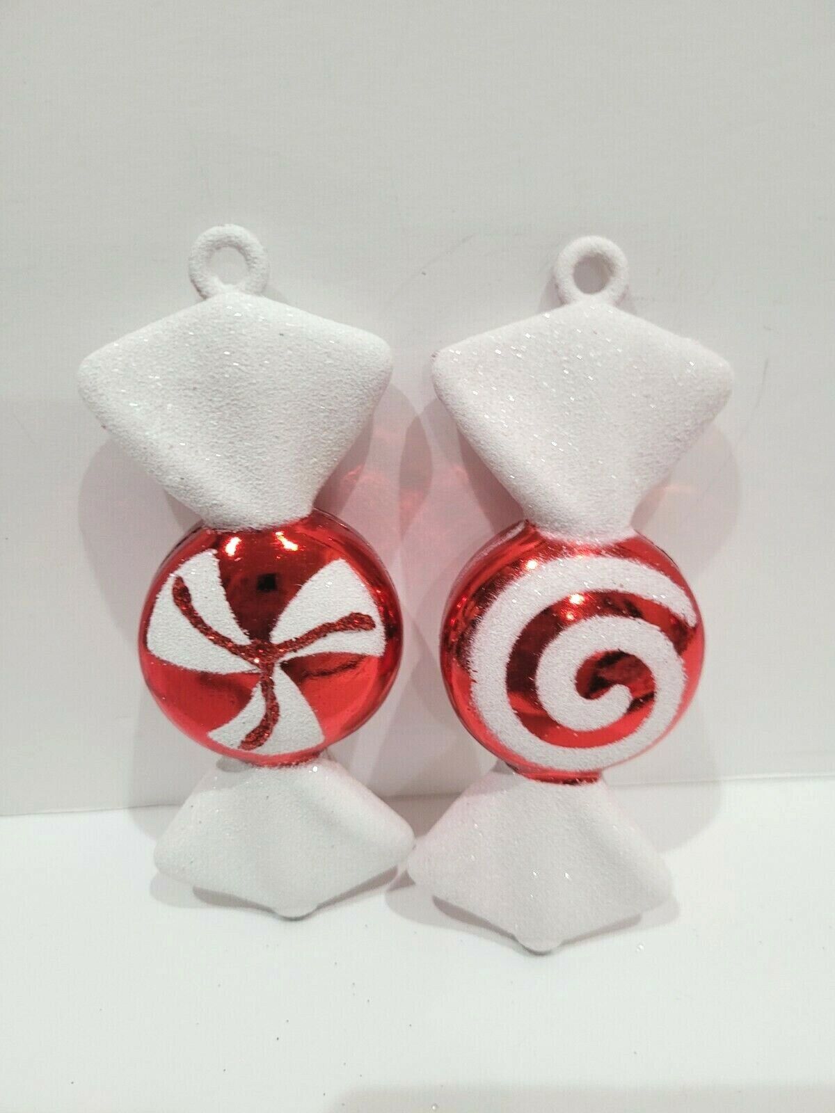 Up for sale we have a set of 8 adorable peppermint candy ornaments for your Christmas tree, Wreath or Garland. These ornaments are so cute they are red with white glitter. These measure approx 4.25" including the round tip. These are new but will not come in original box to be able to ship in a smaller box and keep shipping cost down. Please note some of these might has some slight imperfection on the ornaments.