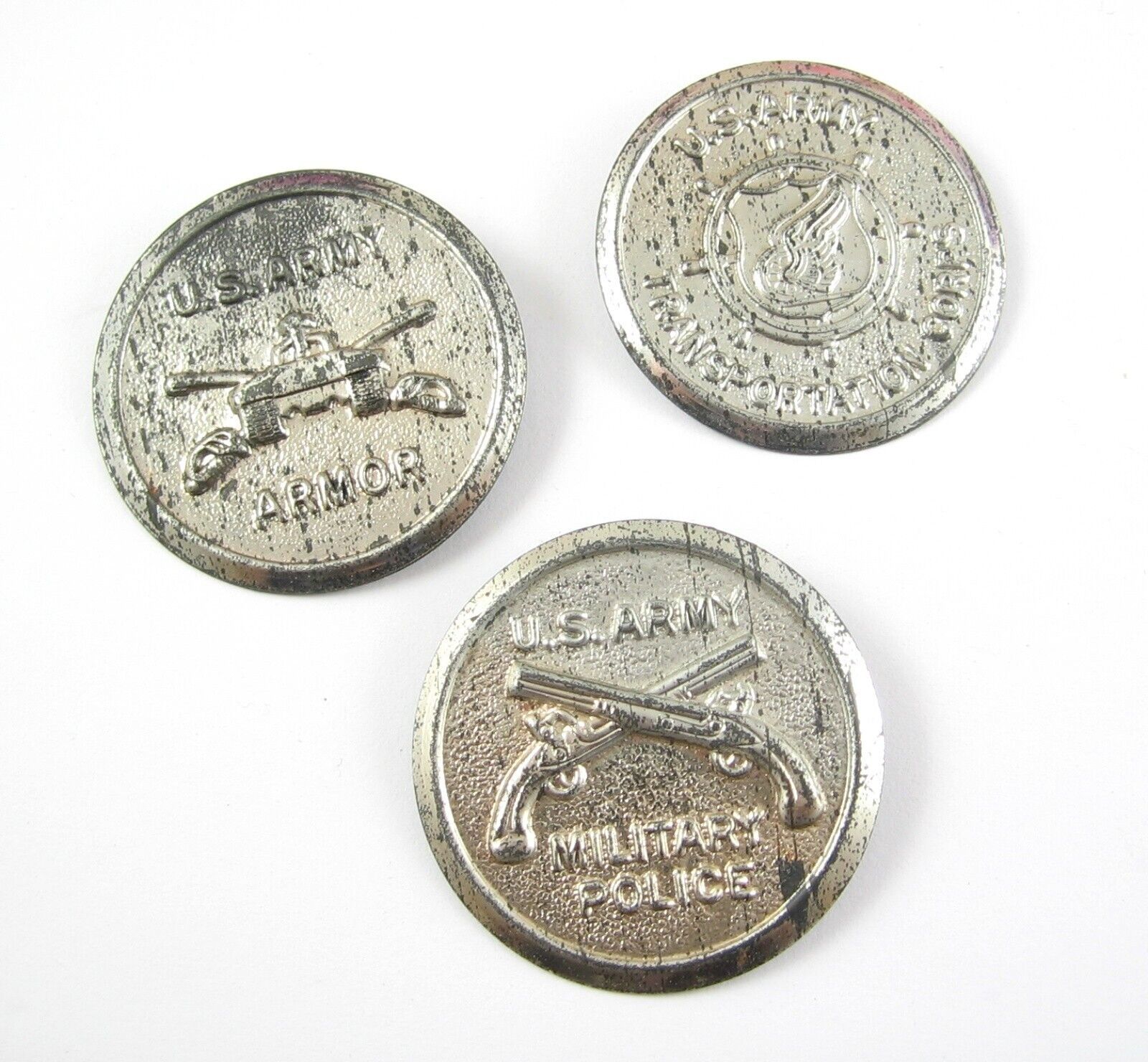 ROUND ALUMINUM or TIN PINS: One each that has a symbol and wording that reads: US Army Military Police, US Army Armor and US Army Transportation Corp. The designs are pressed into the metal from the back. Each one has a C clasp on the back and measures 1 1/2".