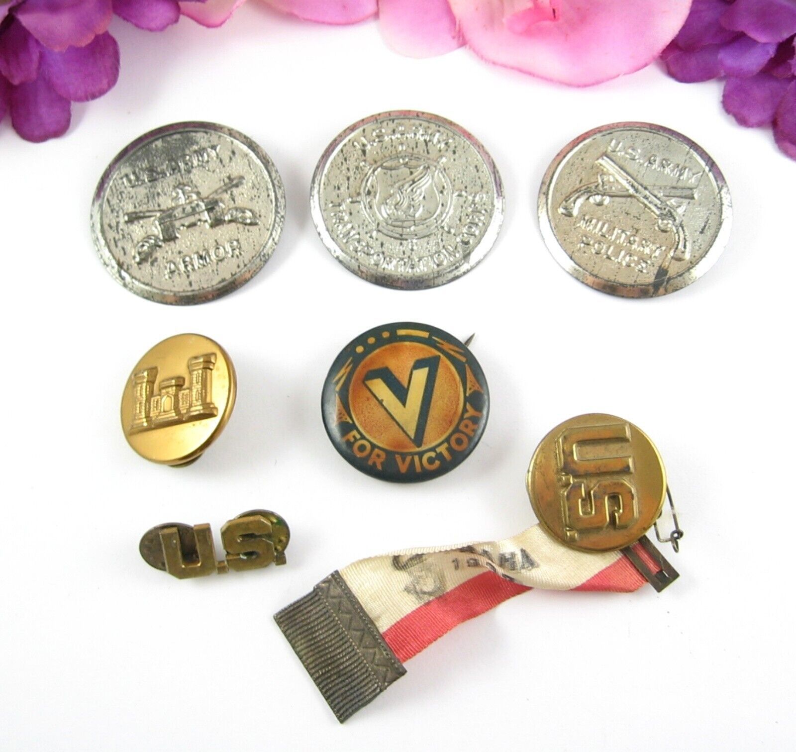 CONDITION: These pins are in pre-owned and vintage used condition. The clasps are in working order. The posts all have their backs. The Ribbon is faded, and the printed information is smeared. The Victory pin is discolored and misshapen with rust on the back. There is scratching and finish wear present.