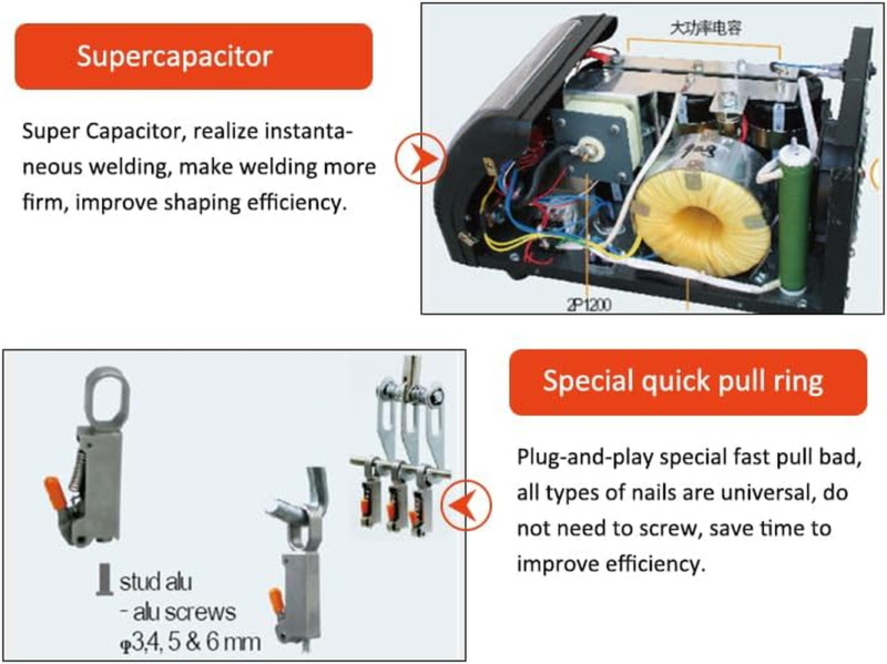 Welding mode arc stud welding Max. Lifting Capacity 2T Welding stud size M4/M5/M6 Features SMART Repair Multipurpose Uses Dent forming?Sheet metal repair?Repair work damage forcar body