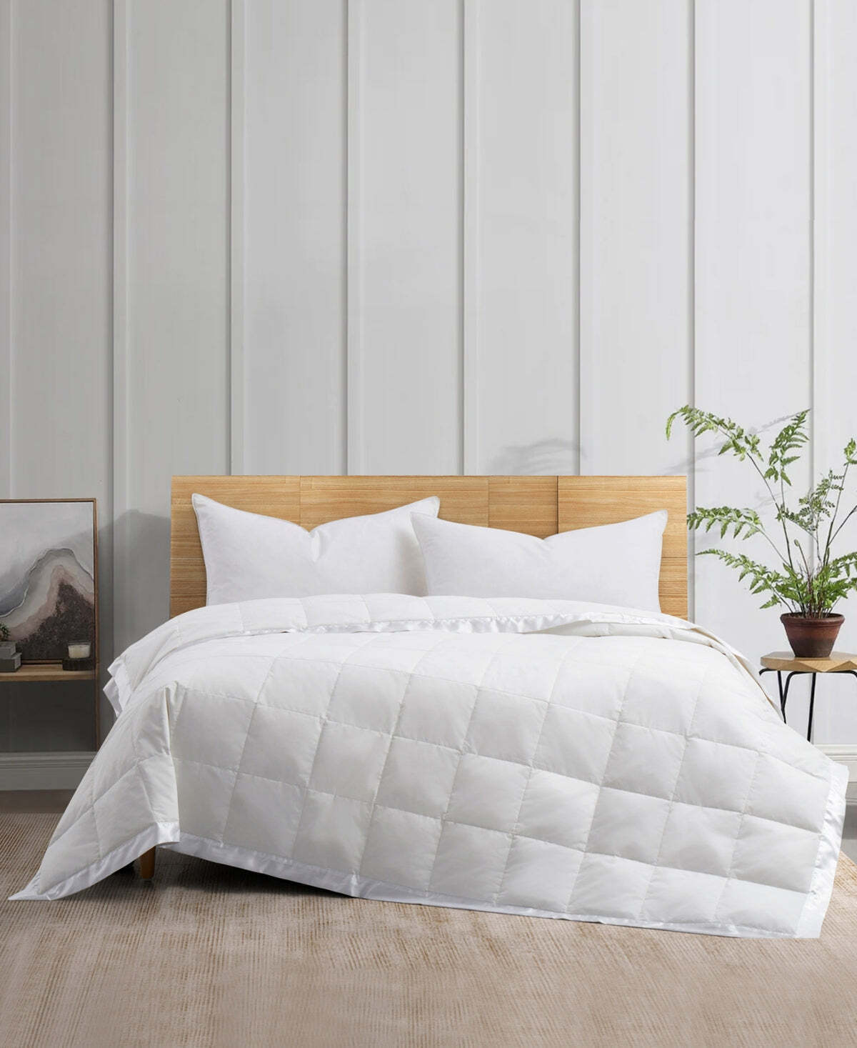 Wrap yourself up in the luxurious comfort of this lightweight down blanket. This ultra-soft blanket is made from 300 thread-count, 100 percent cotton, filled with 75 percent down and 25 percent feather, lightweight but warm. Beautiful satin edging, adds a silky smooth luxury element.