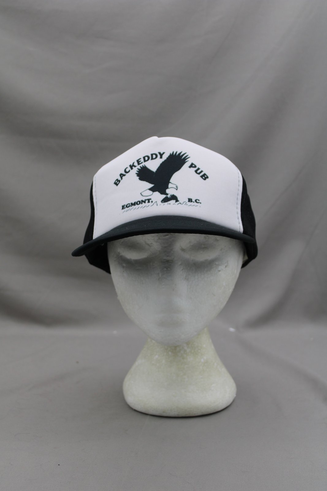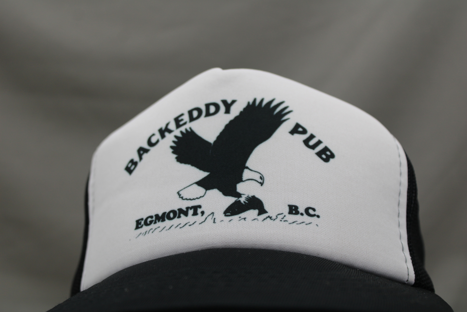 Up for sale is a vintage screened trucker hat. It has a black base colour with a white front and a mesh back. The front of the hat has a graphic of an eagle grabbing a fish with Backeddy Pub Egmont BC screened on around the graphic. What a great vintage hat do not miss out on it.