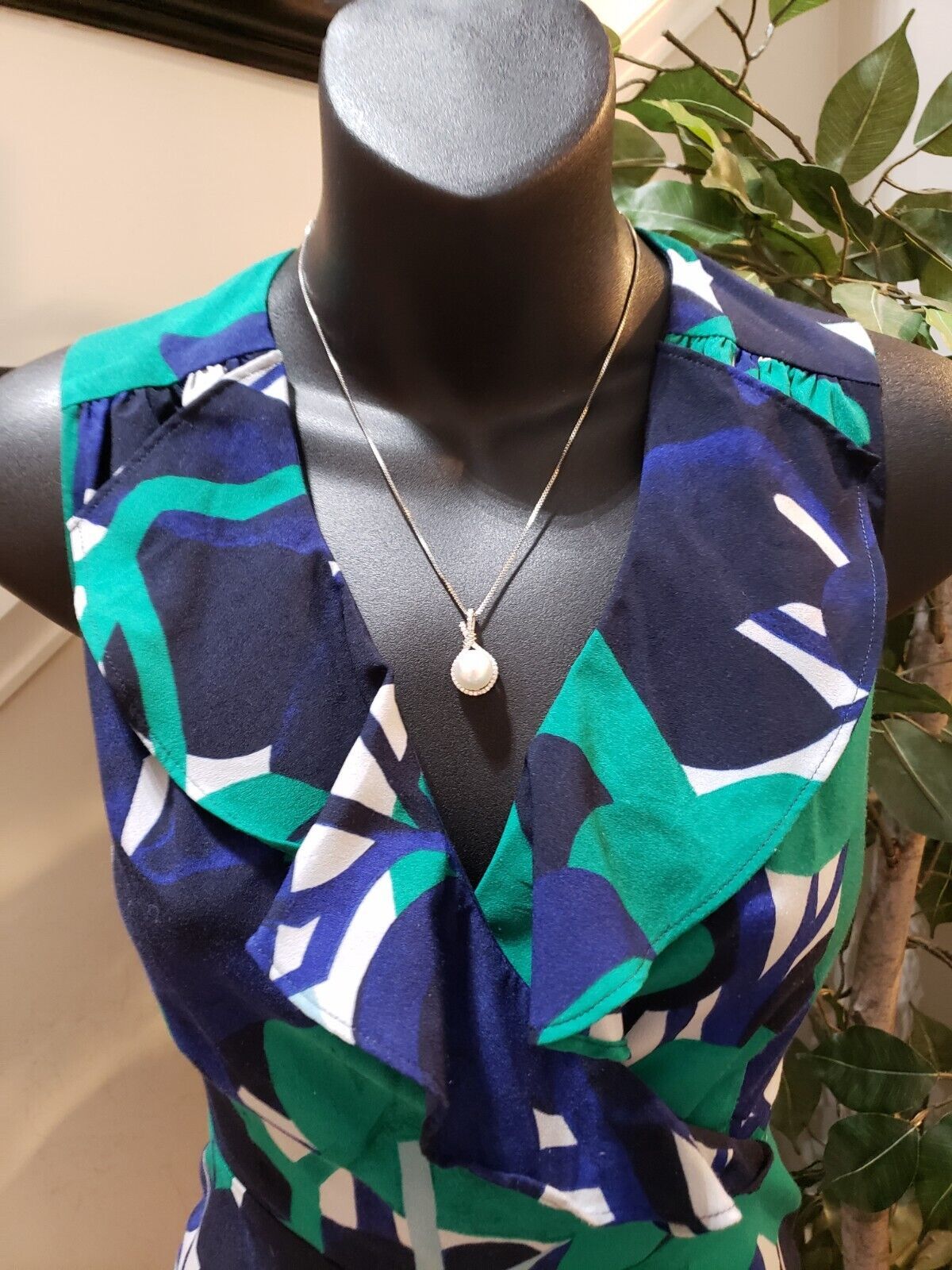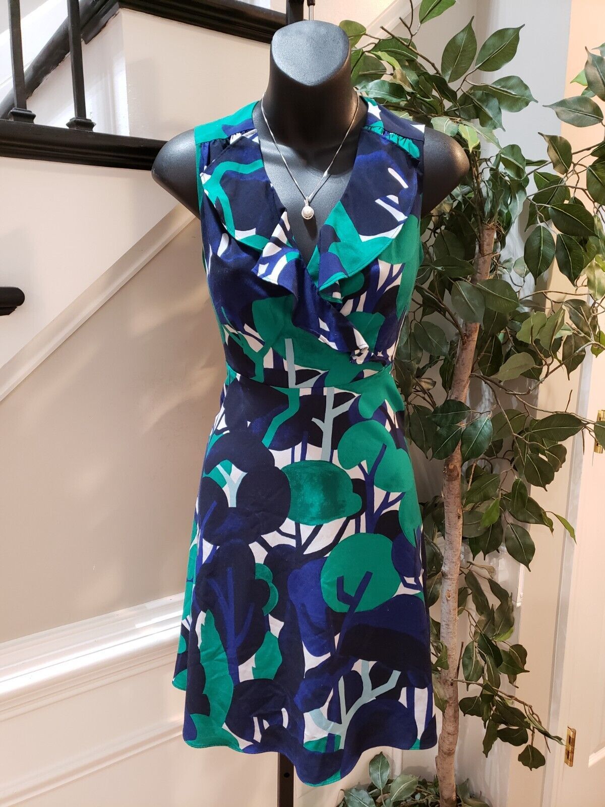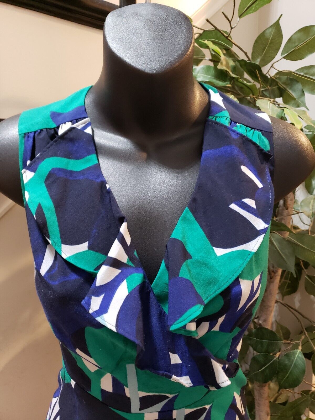 Ann Taylor Womens Blue & Green Polyester V-Neck Sleeveless Knee Length Dress 00P