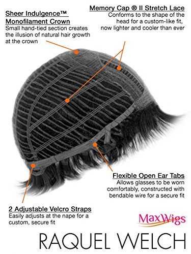 Product description: Raquel Welch Lace Front Wigs, Tru2Life Collection, Fiber: Synthetic Hair, Cap Size: Average, Sheer Indulgence Lace Front, Monofilament Top, 100% Hand-Tied Base, Hair Length:Front 7" Crown 9.5" Side 9" Back 9" Nape 6.5", Weight: 3.0 ozSuitable for Oval, Round, Square, Diamond, Heart and Pear shaped faces. This 100% hand knotted classic mid-length page combines the natural looking hairline of a Sheer Indulgence Lace front cap for off the face styling with the cool, light comfort of the Sheer Indulgence Monofilament Top, plus the added styling versatility of our heat friendly Tru2Life synthetic hair. Tru2Life heat-resistant fiber can withstand heat up to 180 celsius.(Low setting recommended.). Upstage try the inside back of the wig first before you use the heating tools to style all of the wig. It's not just a wig-it's like your own hair. Introducing UPSTAGE, Raquel Welch new Sheer Indulgence 100% hand-knotted Lace Front wig in Raquel Welch heat-friendly Tru2Life synthetic hair. Designed with the hair loss client in mind, this new luxe style is crafted to offer the ultimate in fashion and comfort. Made to exact specifications, you'll enjoy all the features of Raquel Welch monofilament top Sheer Indulgence styles, a 1 1/2" deep, virtually invisible sheer lace front, plus an incredible sheer lace front, plus an incredibly light and comfortable 100% hand-knotted base. The fiber throughout the entire top is individually knotted, one by one. The look A low density, natural looking hairline that allows forward movement and the look of natural growth. With amazing off-the-face styling versatility and the flexibility to part hair on the left or right or center, you'll swear the hair is growing right out of the scalp. Luminous, hand blended Tru2Life salon-inspired colors provide the look and highlights of natural hair. Best Wig Outlet is the leading online source for affordable, high quality, and glamorous wigs, hair extensions, hair pieces, and human hair wigs - Made by.