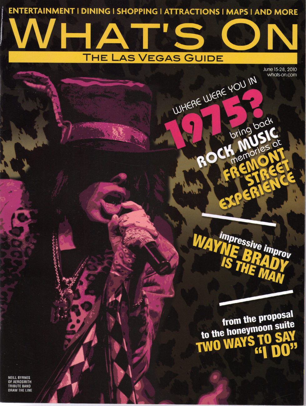 The magazine features tribute bands, DRAW THE LINE, who has toured the world peforming Aerosmith's songs, with Tyler lookalike singer, NEIL BYRNES; DESPERAD0, an Eagles Tribute band with lead singer, AARON BROERING.