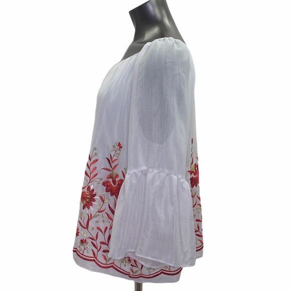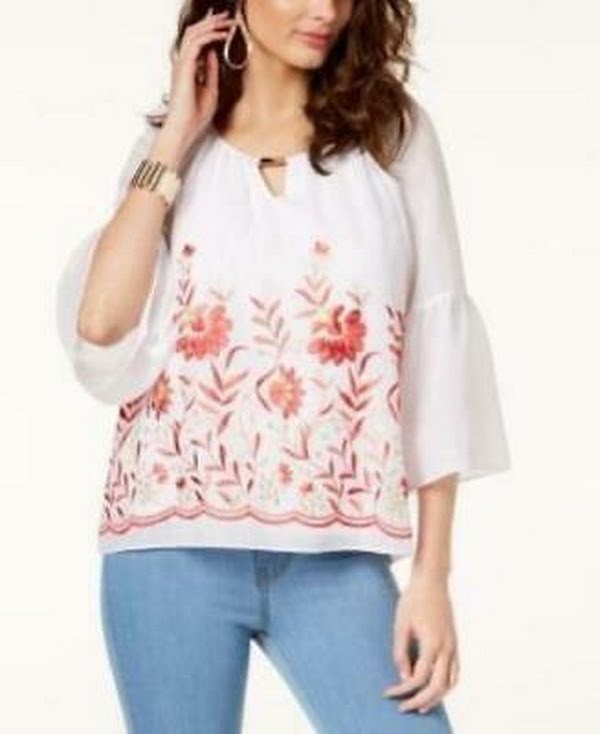Thalia Sodi Embroidered Keyhole Top, Womens Clothing - Tops. Hits at hip Scoop neckline with keyhole and hardware Floral embroidery throughout 3/4-sleeves Shell: rayon/polyester; lining, trim: polyester M/Whiteachine washable