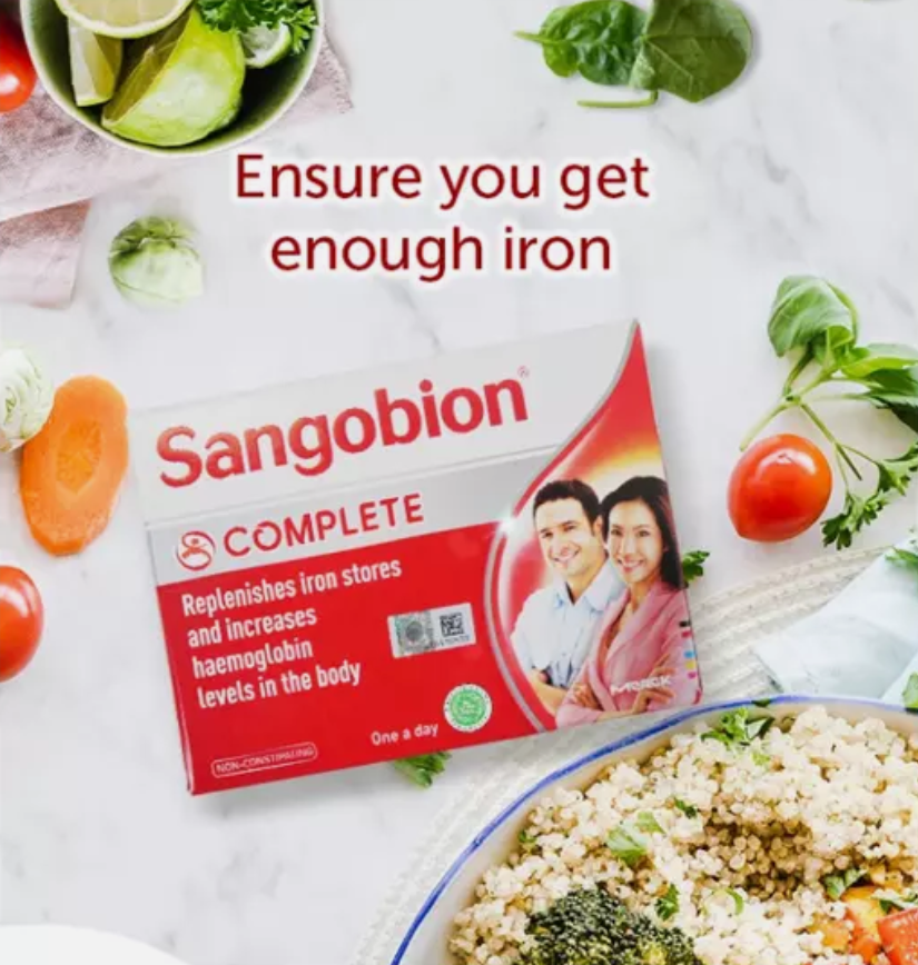 - SANGOBION replenishes iron stores and increase haemoglobin levels in the body. - Symptoms of anemia are pallor/pale looking, weakness, headache, breathlessness, dizziness or rapid heartbeat.