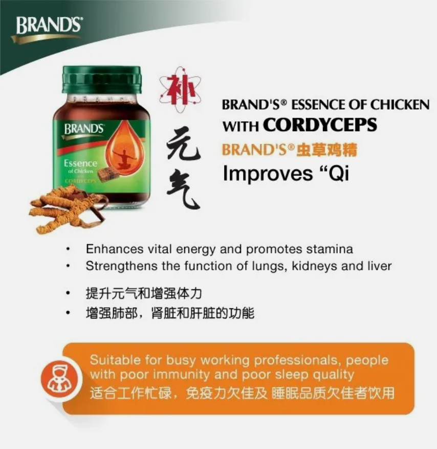 BRAND'S Essence of Chicken with Cordyceps is a food supplement for those who want to remain active and individuals who work long hours and lack proper rest. It is formulated with the principal herbs, cordyceps combined with essence of chicken. Drinking a bottle of BRAND'S Essence of Chicken with Cordyceps everyday will help increase your Qi, or vital energy that flows through the body to improve stamina, overall well-being, speed up the recovery from fatigue and for recuperation purpose. The combination of principal herbs - Cordyceps with Essence of Chicken also helps to strengthen the function of lungs, kidneys, liver, and concurrently improves blood circulation.