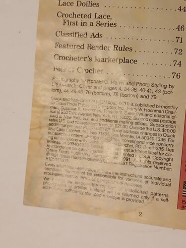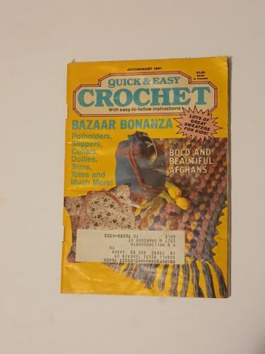 This is an original copy of Quick Easy Crochet Magazine. This is the July/August 1991 issue. The cover has minor shelf wear. There is minor water damage to the cover, see photo 2. The pages are clean. There are no missing or torn pages.