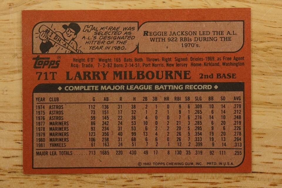 1982 Topps Baseball Card LARRY MILBOURNE and 50 similar items