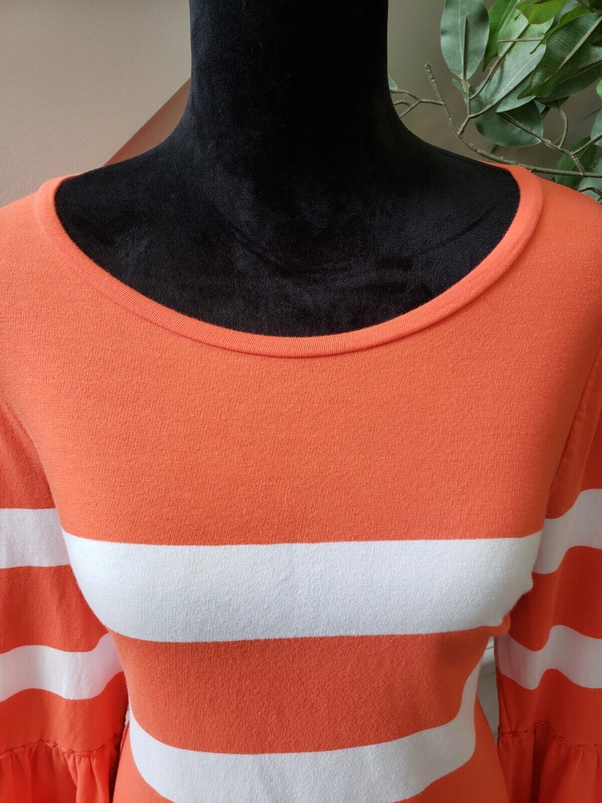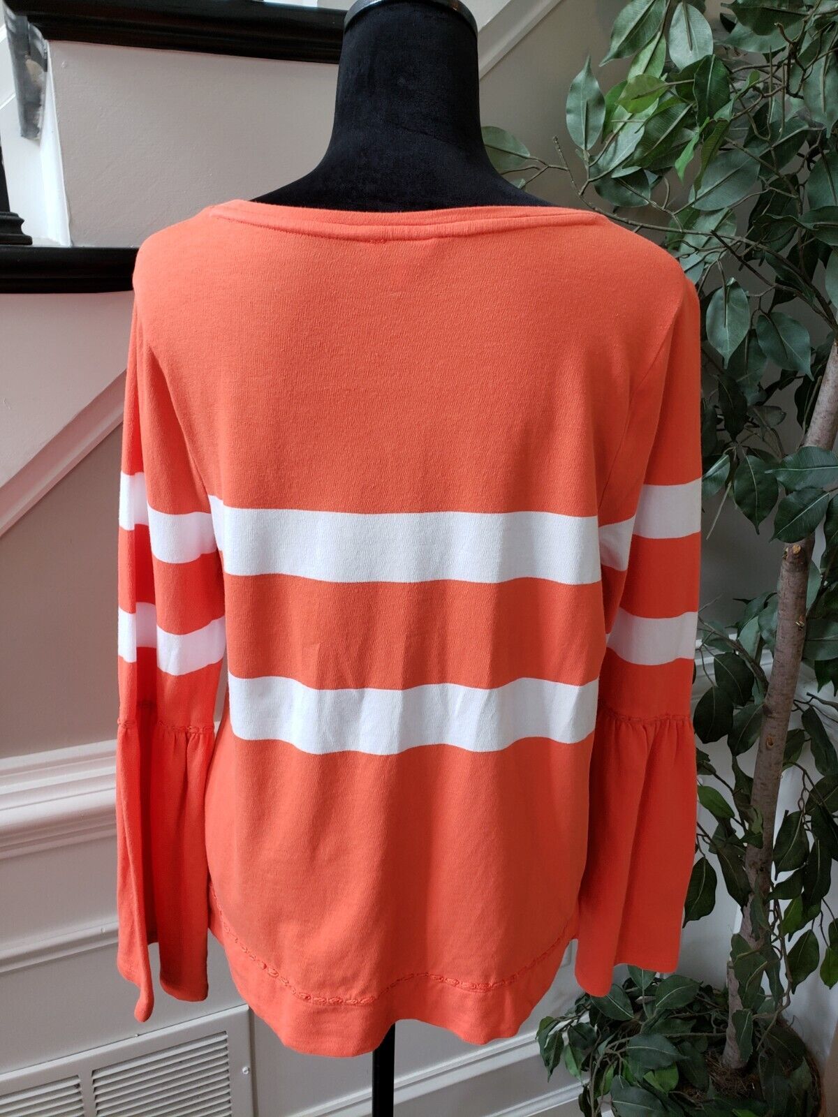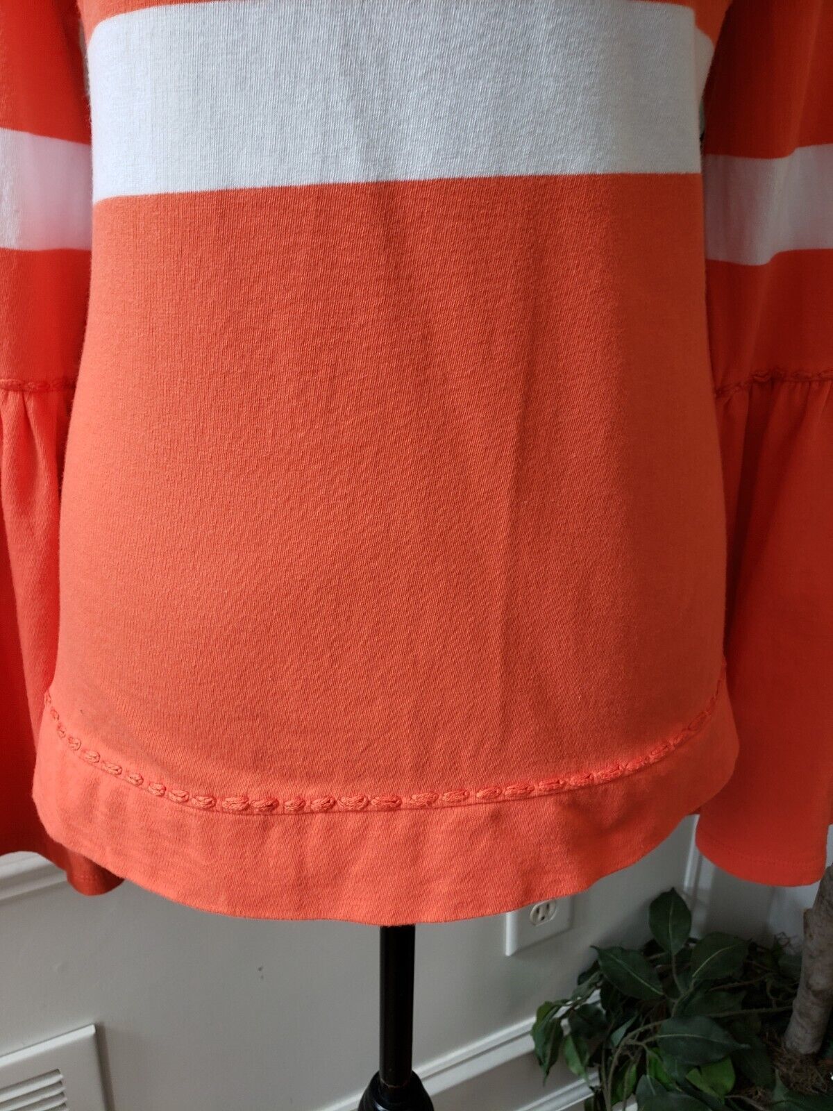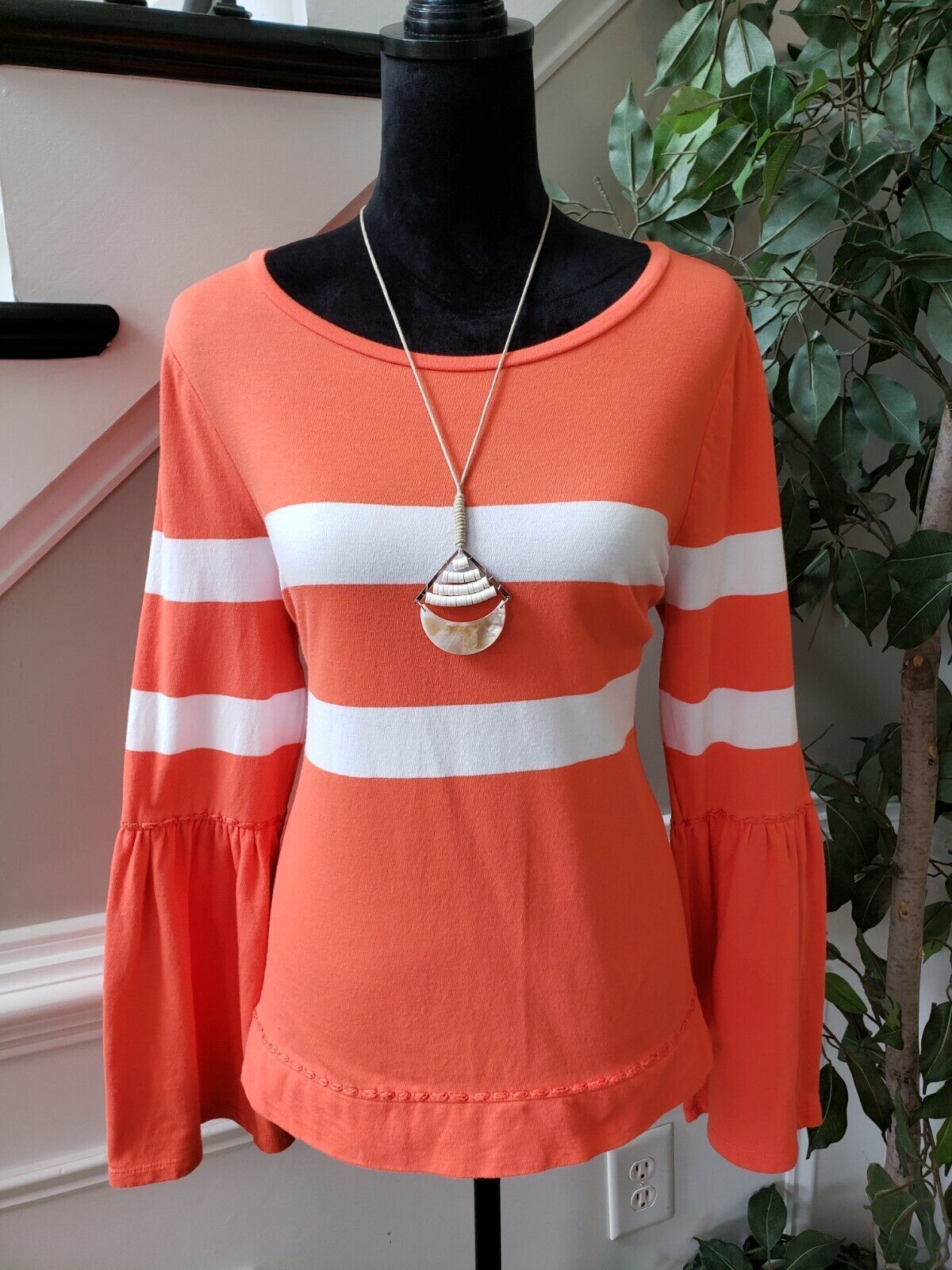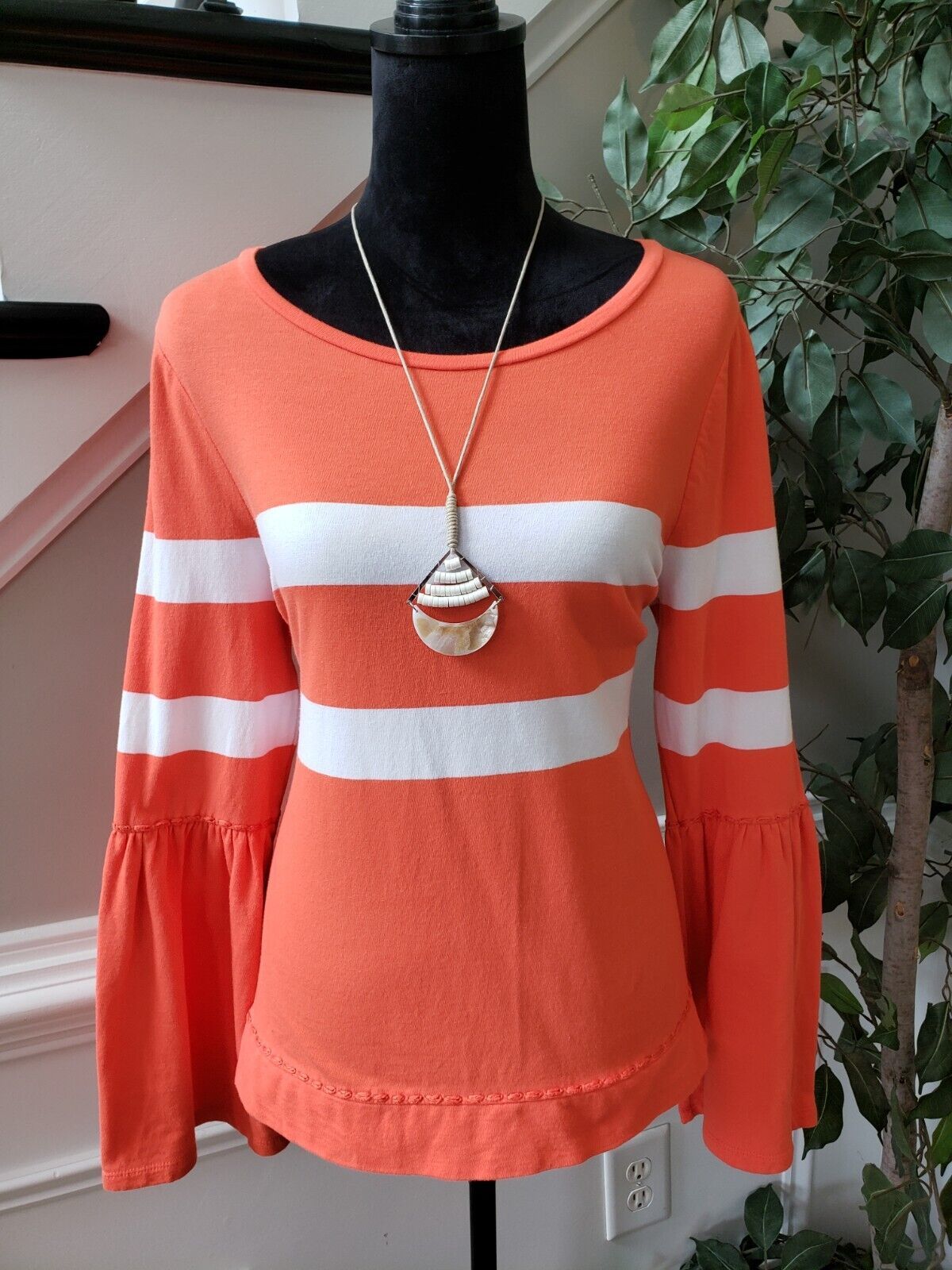 Crown & Ivy Women's Orange & White Cotton Round Neck Long Sleeve Top Blouse M