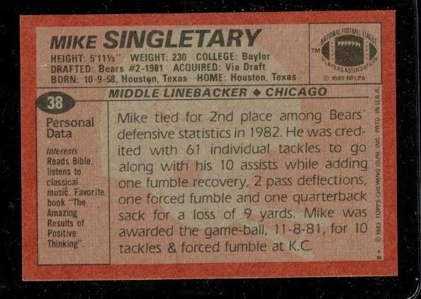 Mike Singletary RC 1983 Topps #38 Chicago Bears HOF Rookie Vintage Football Card