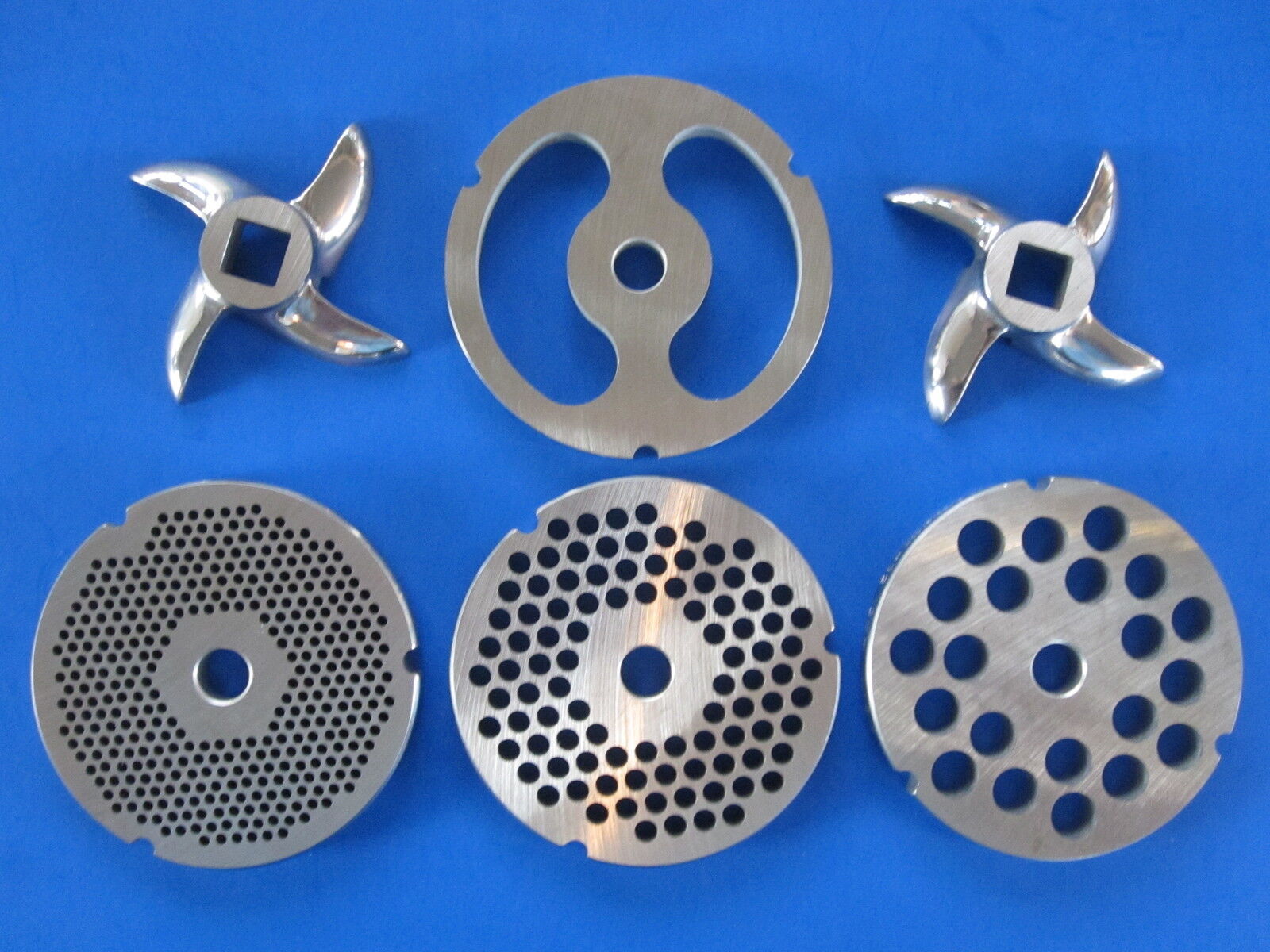 Four grinding plates and Two commercial grade stainless knives for #32 size manual and electric grinders.
