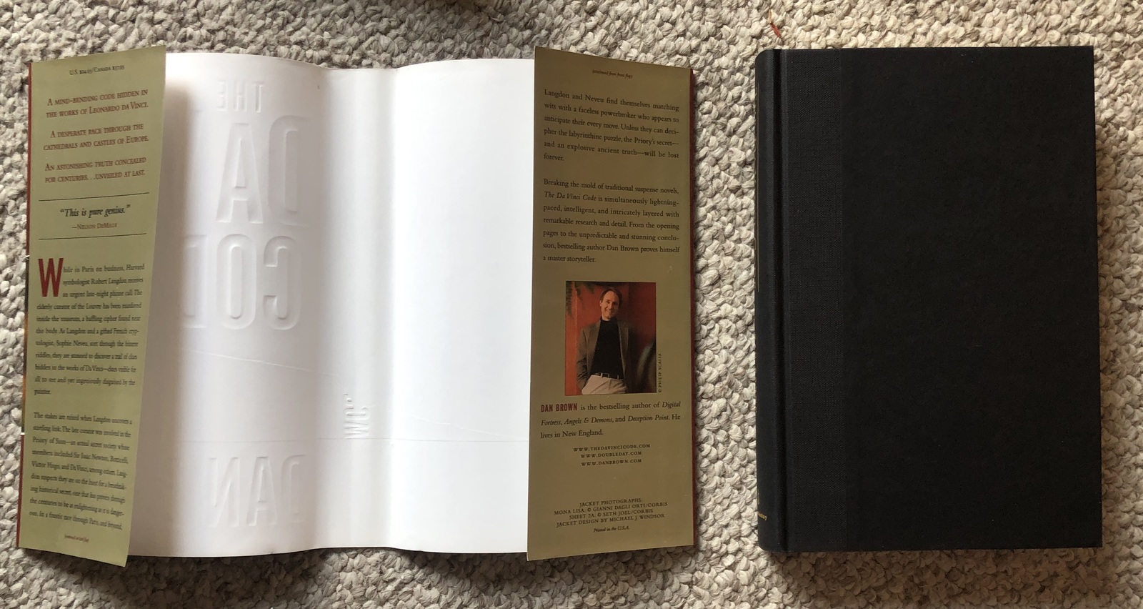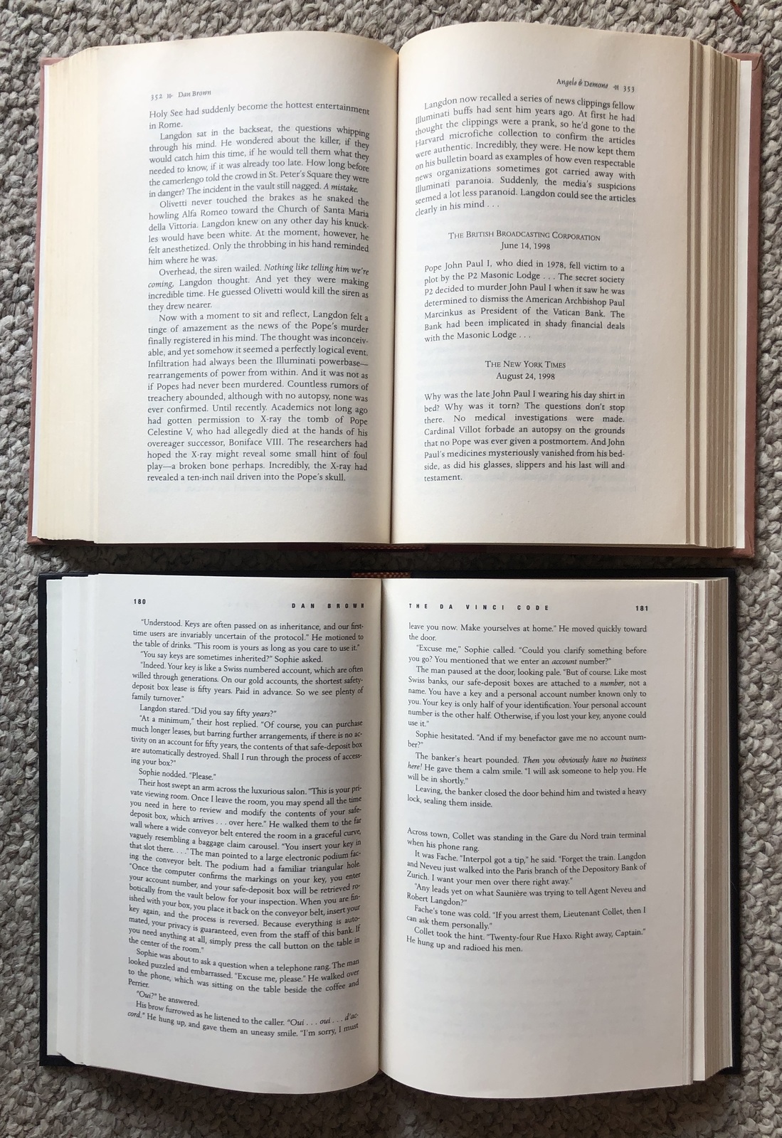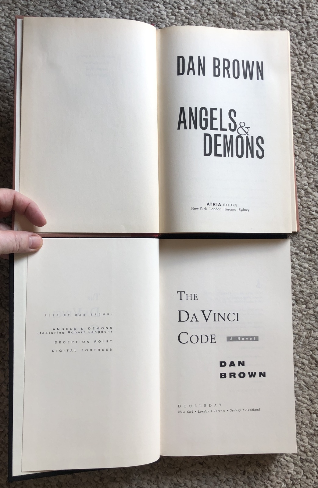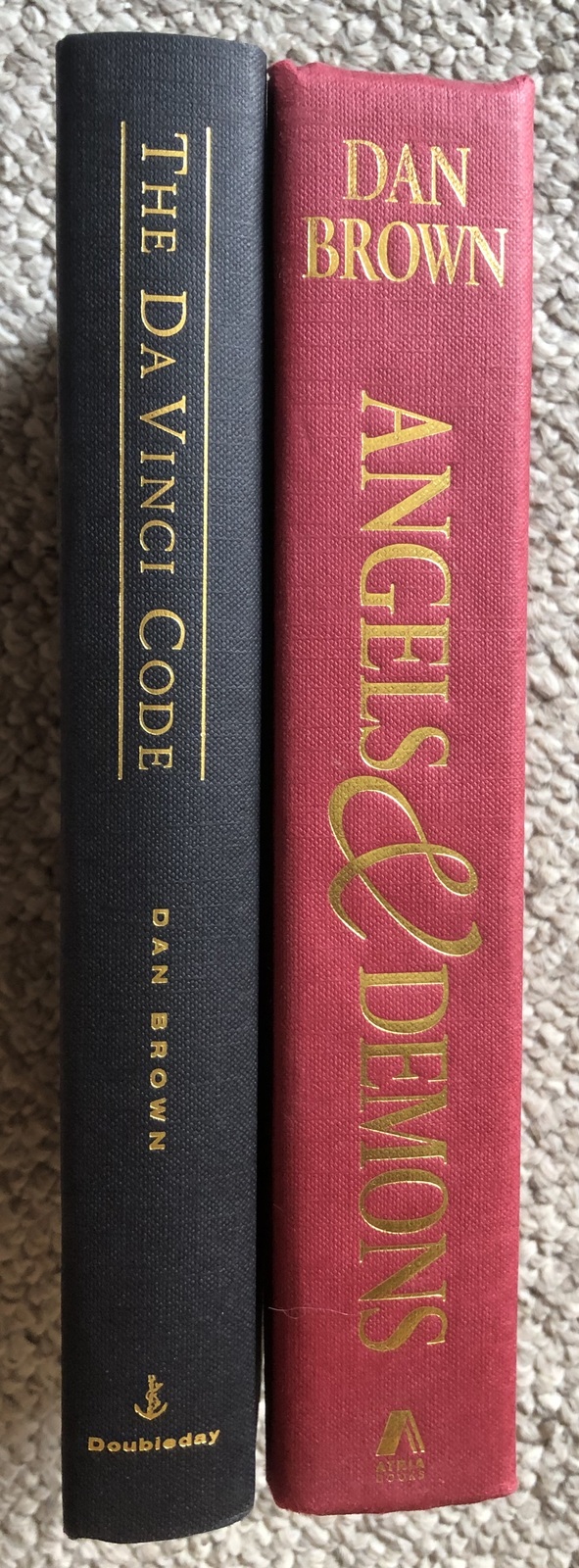 Two Dan Brown hardcovers. Angels Demons is missing its dust jacket. Da Vinci Code was probably originally from a smoking home. It's not noticeable to me at reading distance, but I think I get a whiff when my nose is close to pages. Please take into account if you have allergies.
