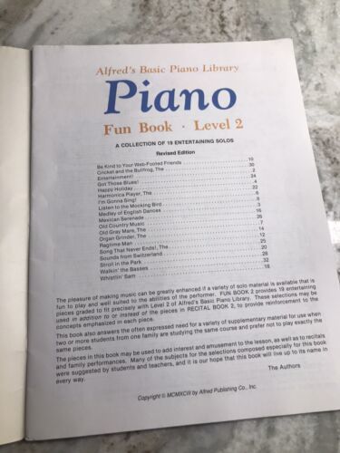 This piano lesson book is a great addition to any musician's collection. It features a collection of songs and exercises designed to improve your piano playing skills. The book is part of Alfred's Basic Piano Library, and is perfect for those looking to expand their musical knowledge.