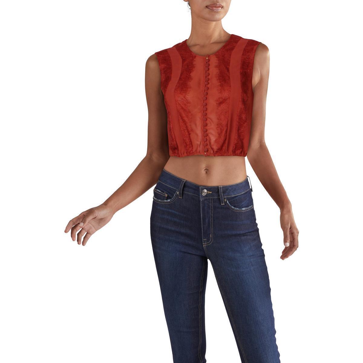 Guess Womens Brown Lace Patterned Cap Sleeve V Neck Crop Top, Size Large