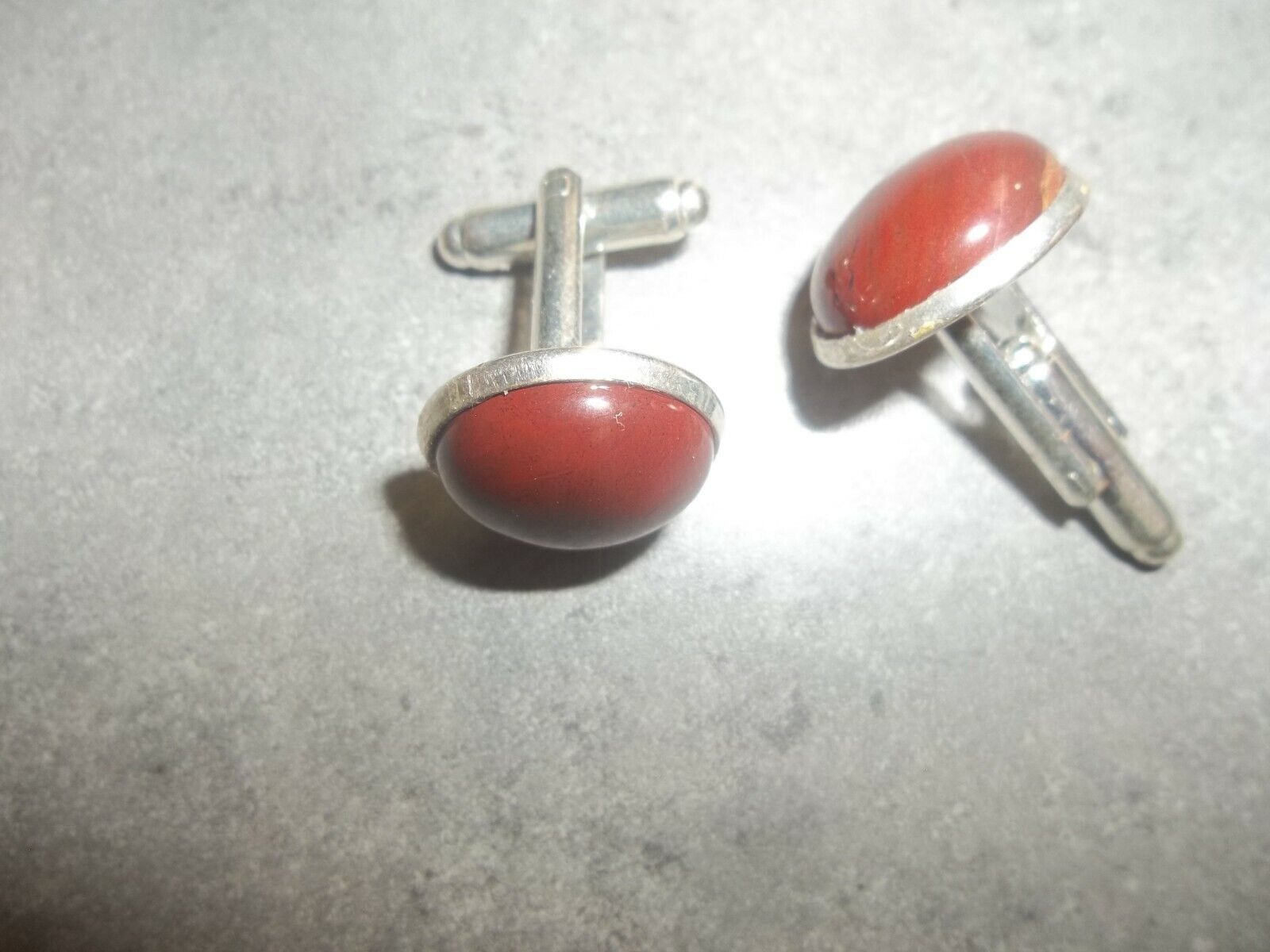 This cuff-link set is done with jasper cabs. The stones are beautiful. I have done my best to match up the stones then I set them to have as closely matched pair as possible. Silver plated brass settings. Very nice. The stones are cut with a flat back and actually set in rather deep on the settings. I am very happy with how they turned out. I have made several pairs of a couple different kinds. Take your time looking through them. Very beautiful stones. You are always welcome to contact me as well. Happy to do custom orders of any sort.