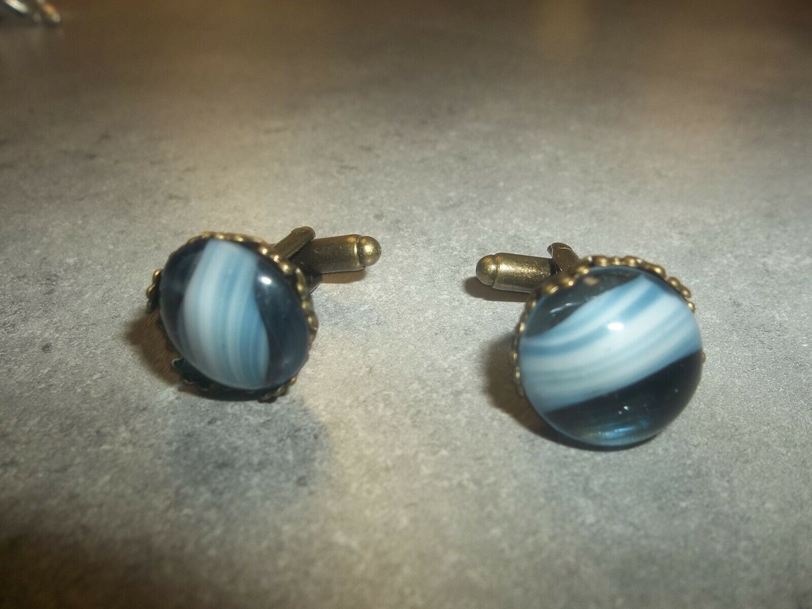 This cuff-link set is done with glass striped cabs. The stones are beautiful. I have done my best to match up the stones then I set them to have as closely matched pair as possible. Gold colored brass settings. Very nice. The stones are cut with a flat back and actually set in rather deep on the settings. I am very happy with how they turned out. I have made several pairs of a couple different kinds. Take your time looking through them. Very beautiful stones. You are always welcome to contact me as well. Happy to do custom orders of any sort.